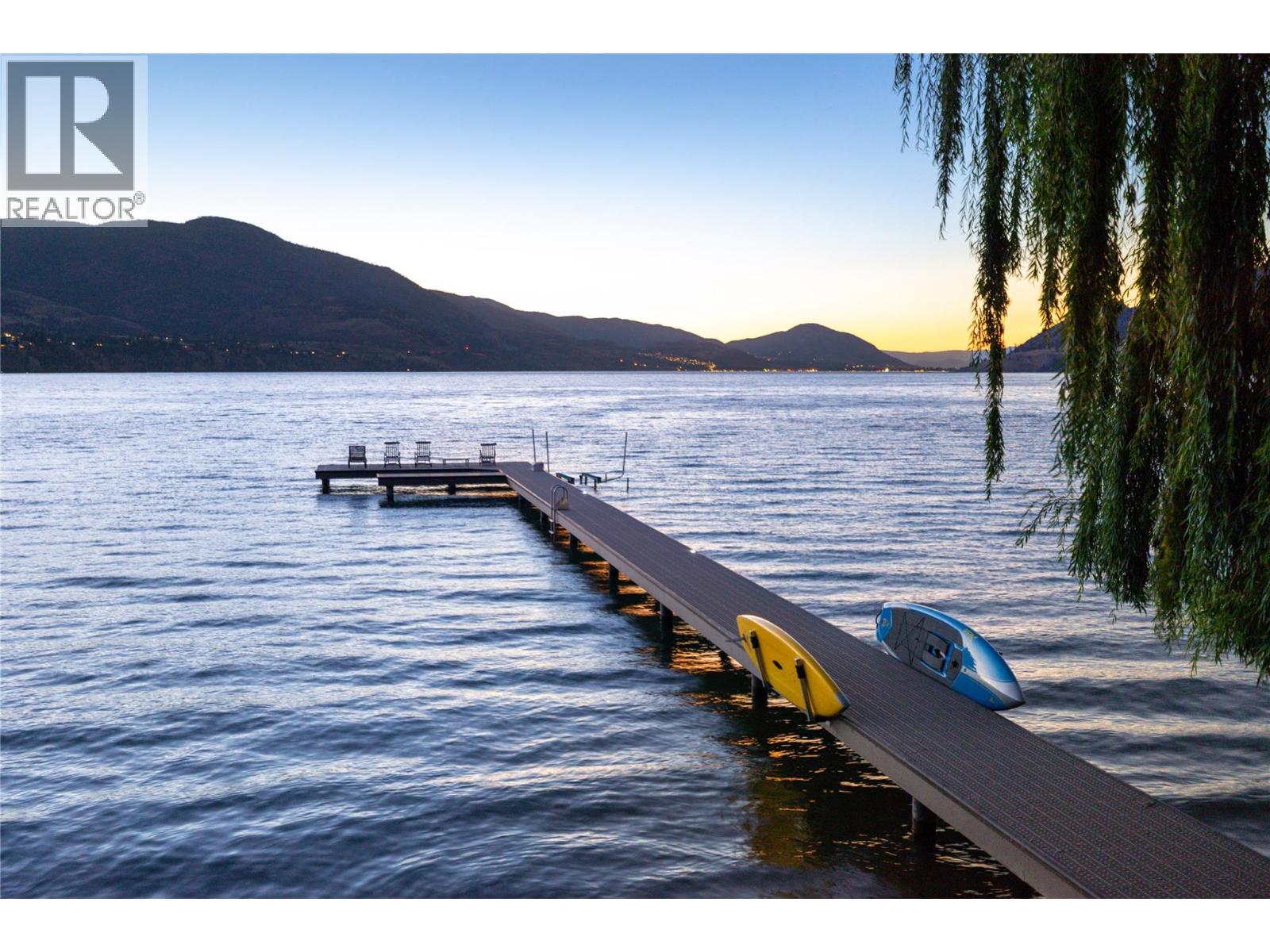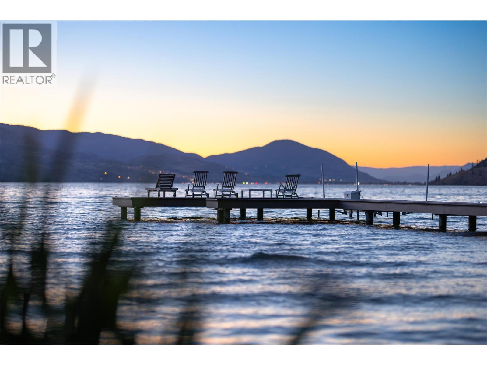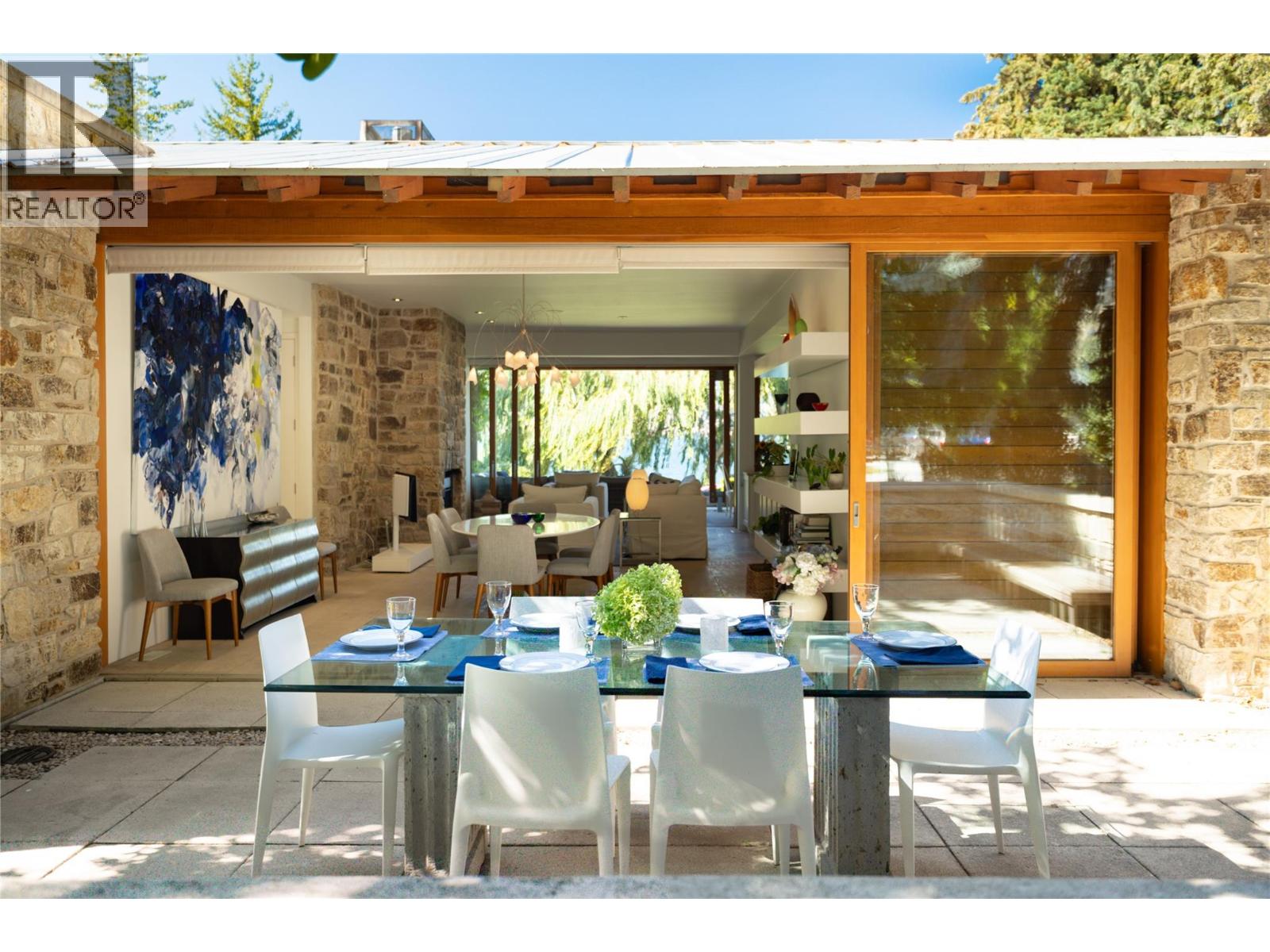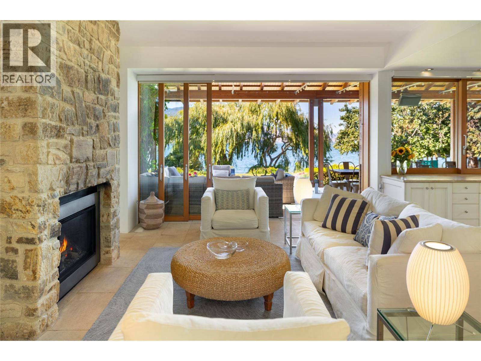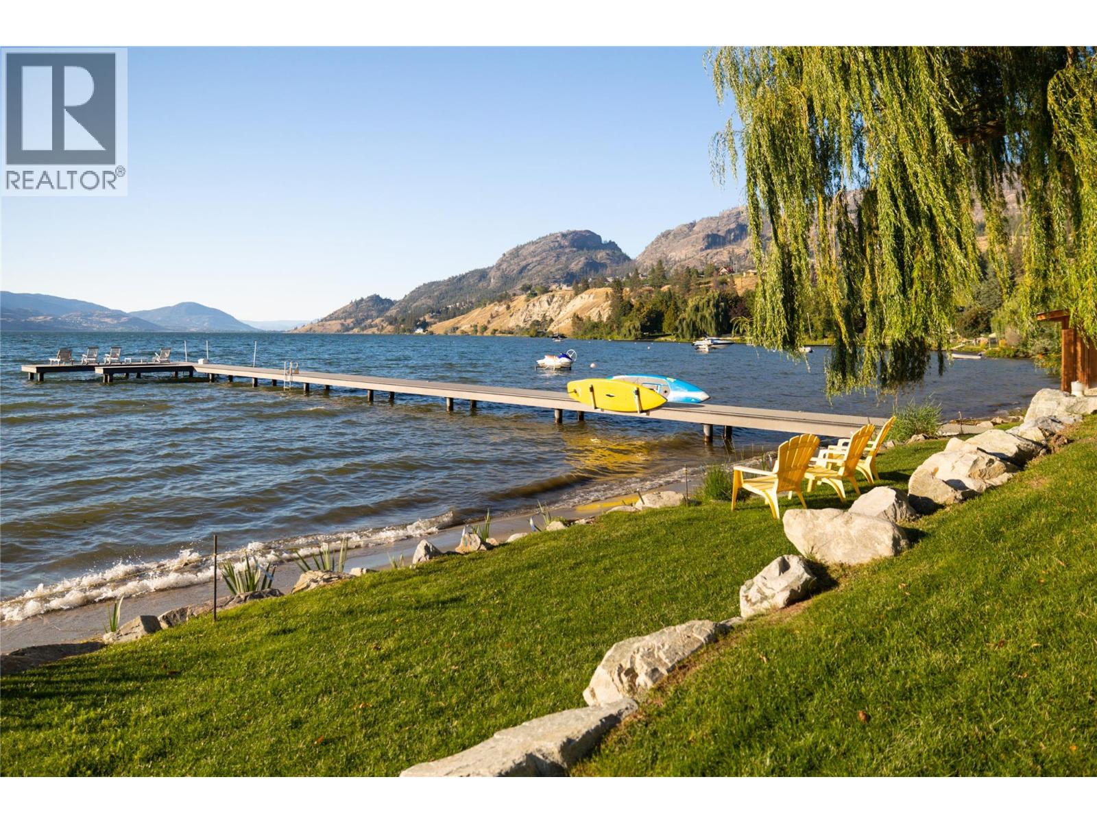 Beautiful unique waterfront home on the shores of Skaha Lake, offering 0.56 acres with a sandy beach and private dock. This contemporary residence captures timeless elegance in a premier lakefront setting. Award winning architect Cedric Burgers has designed a stunning residence which perfectly complements its surroundings, with extensive use of natural wood and stone. Architecturally designed with gorgeous and innovative features, the main level boasts fully pocketing doors which create a sensational blend of indoor & outdoor living, perfectly blending structure and nature including private dining areas on each side of the home. The kitchen features Wolf appliances, and further pocketing windows opening onto the exterior dining area. Open concept living and dining, with cozy stone gas fireplace. The primary bedroom features sensational lake views and a beautiful ensuite bathroom. Two more bedrooms and a full bath complete the main level. Downstairs is the family retreat, with games/media room, two more bedrooms, and full bathroom. Exceptional quality together with an impeccable choice of materials define this lakefront home. Many features include extensive natural stone detail, heated tile floors throughout, hot tub, and endless outdoor living spaces. The expansive backyard features lush landscaping for all the summer activities, blending perfectly with the architecture of the home. Secure gated entrance and oversized double garage, with workshop/storage & EV charger. Newly built dock with boat lift and storage for paddle boards and more. (id:47466)