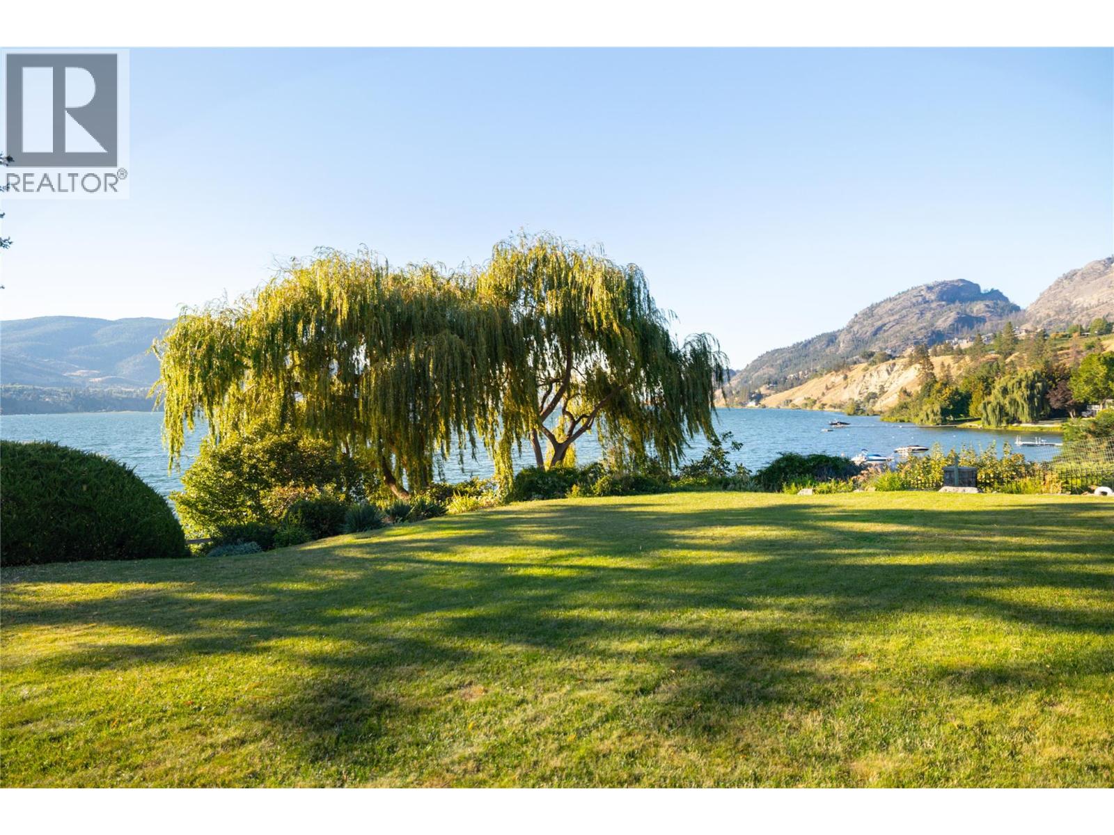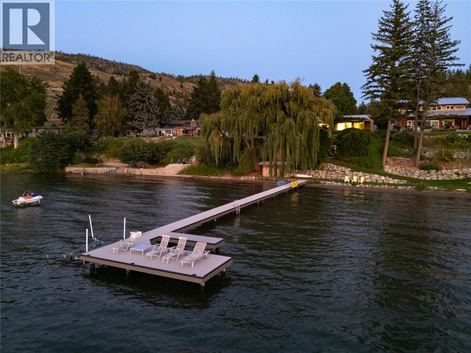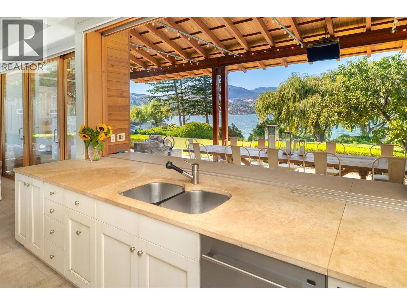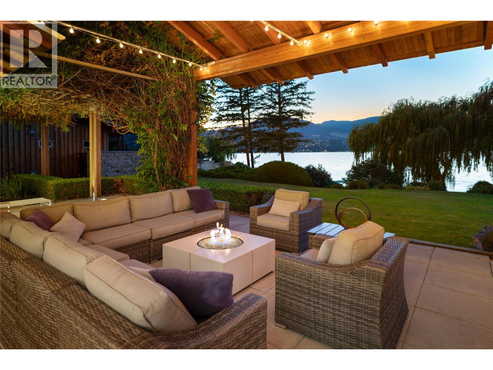 Beautiful unique waterfront home on the shores of Skaha Lake, offering 0.56 acres with a sandy beach and private dock. This contemporary residence captures timeless elegance in a premier lakefront setting. Award winning architect Cedric Burgers has designed a stunning residence which perfectly complements its surroundings, with extensive use of natural wood and stone. Architecturally designed with gorgeous and innovative features, the main level boasts fully pocketing doors which create a sensational blend of indoor & outdoor living, perfectly blending structure and nature including private dining areas on each side of the home. The kitchen features Wolf appliances, and further pocketing windows opening onto the exterior dining area. Open concept living and dining, with cozy stone gas fireplace. The primary bedroom features sensational lake views and a beautiful ensuite bathroom. Two more bedrooms and a full bath complete the main level. Downstairs is the family retreat, with games/media room, two more bedrooms, and full bathroom. Exceptional quality together with an impeccable choice of materials define this lakefront home. Many features include extensive natural stone detail, heated tile floors throughout, hot tub, and endless outdoor living spaces. The expansive backyard features lush landscaping for all the summer activities, blending perfectly with the architecture of the home. Secure gated entrance and oversized double garage, with workshop/storage & EV charger. Newly built dock with boat lift and storage for paddle boards and more. (id:47466)