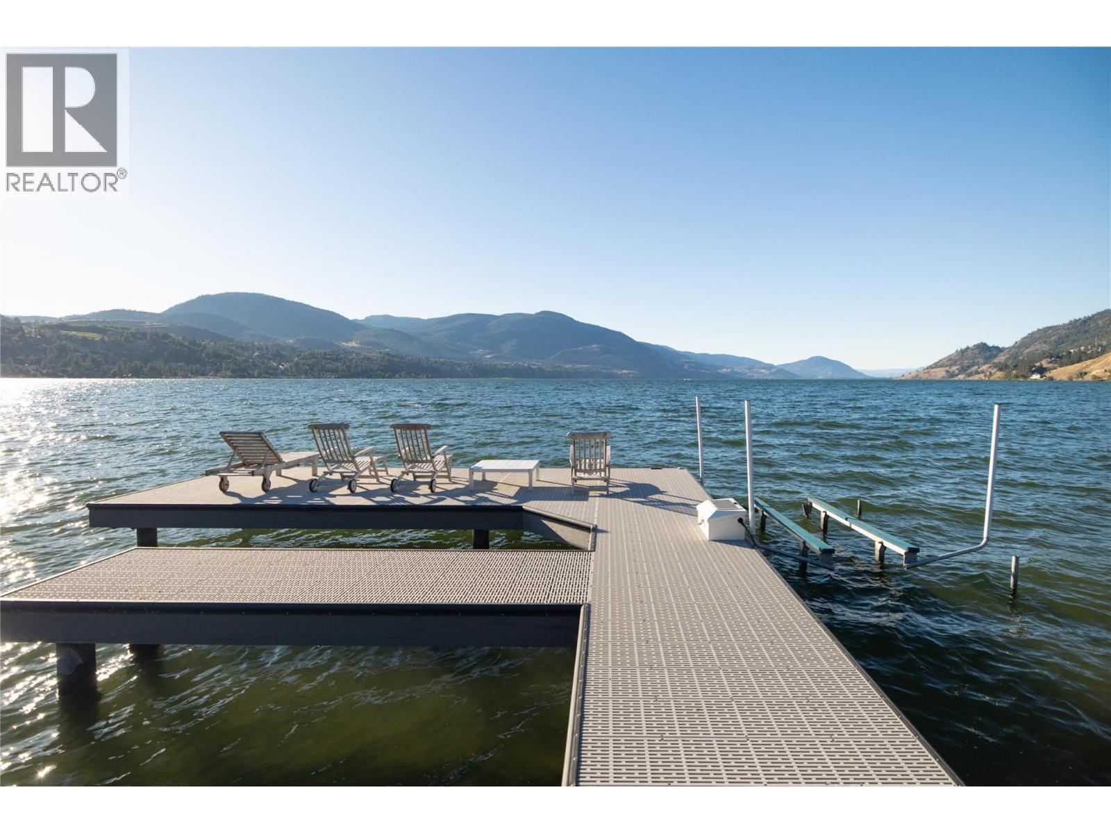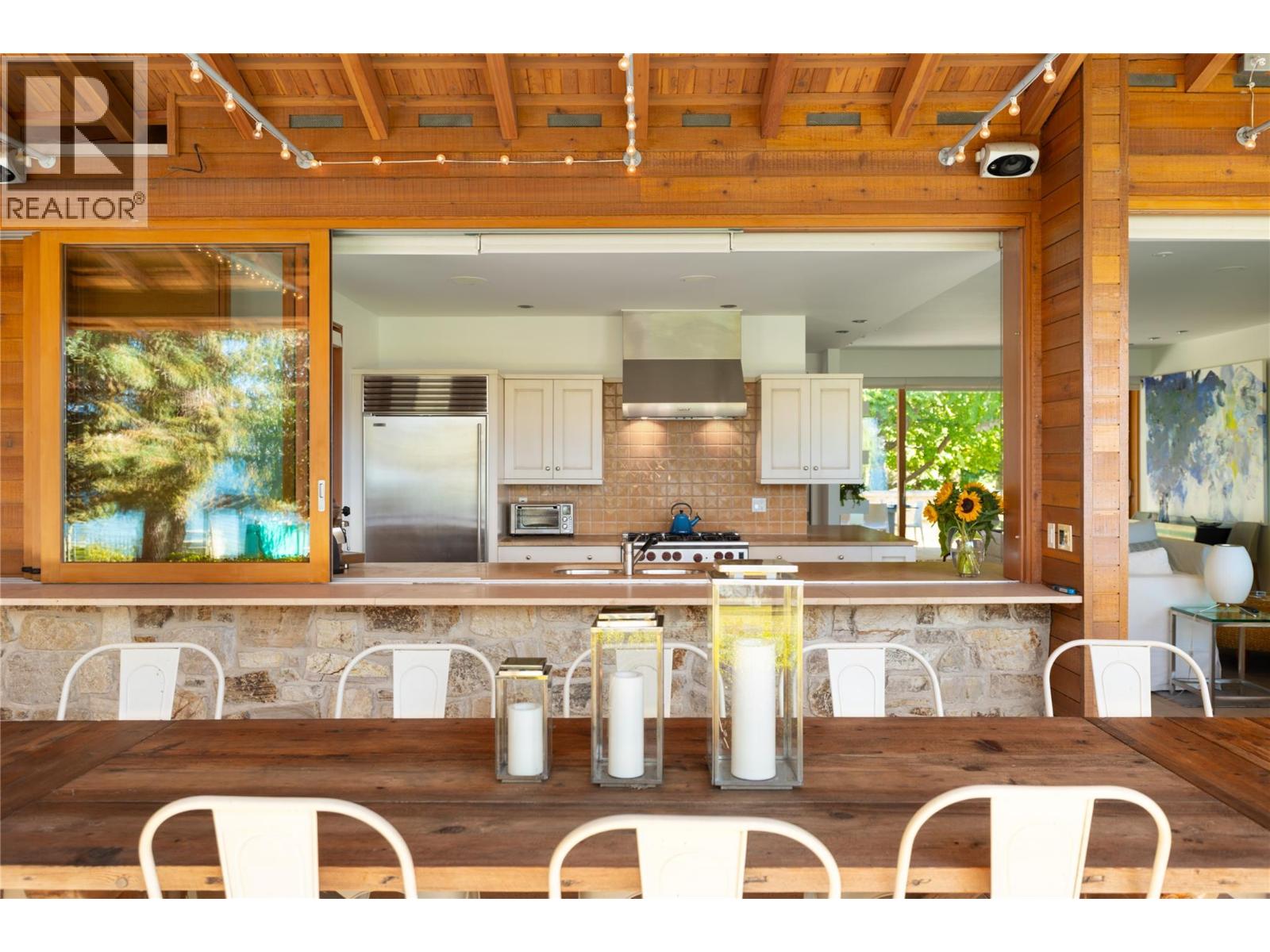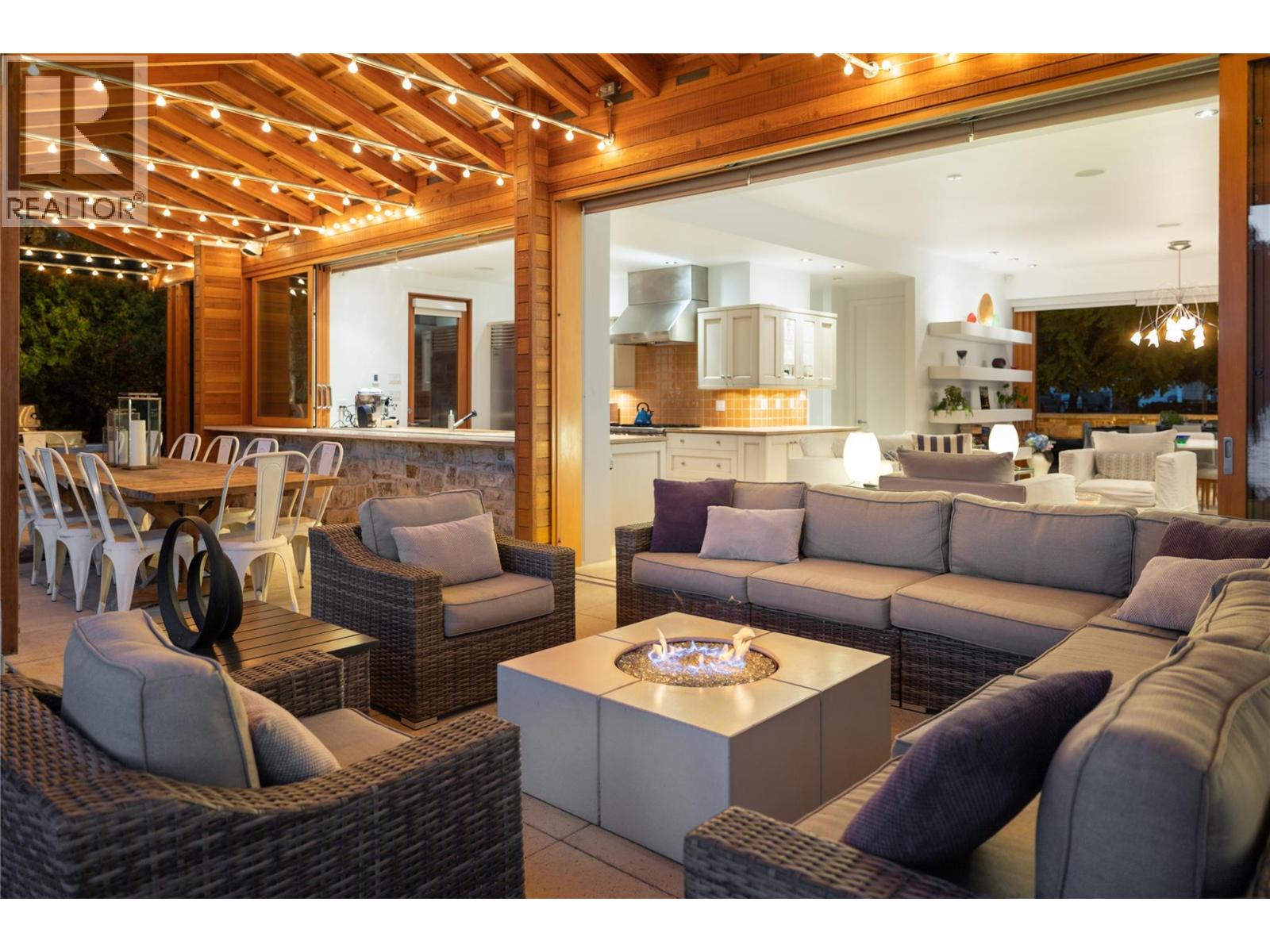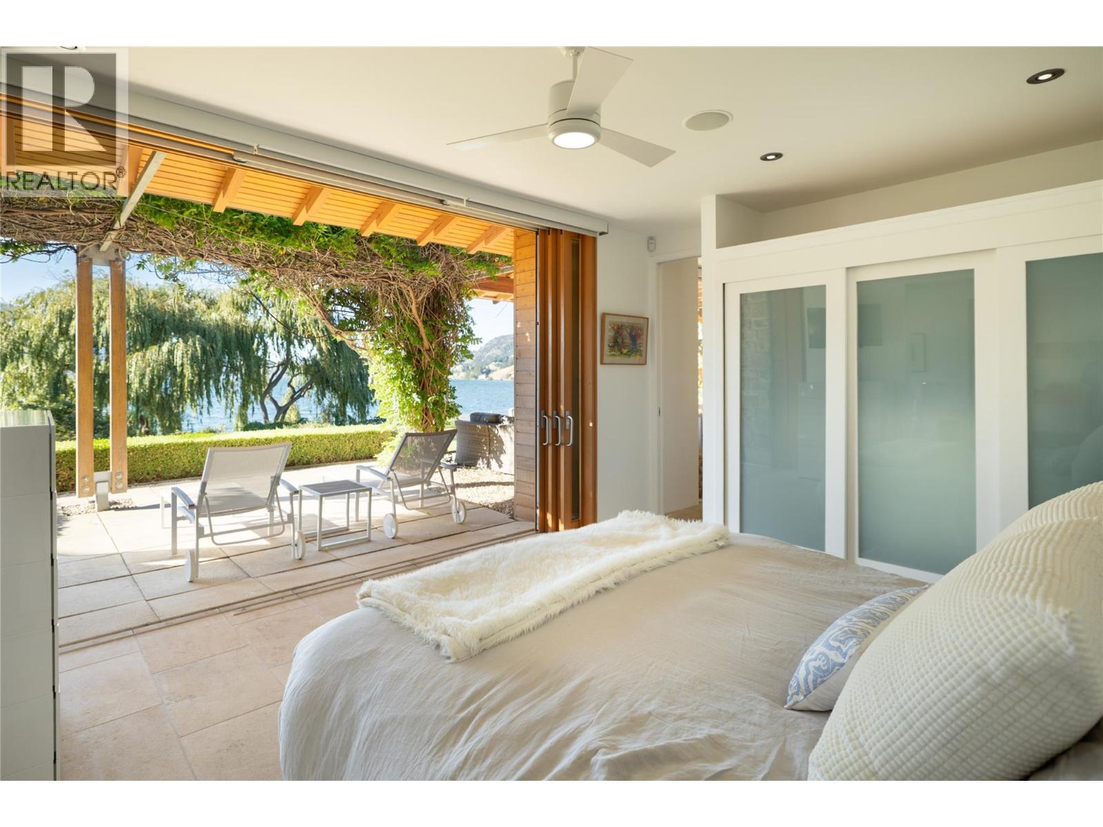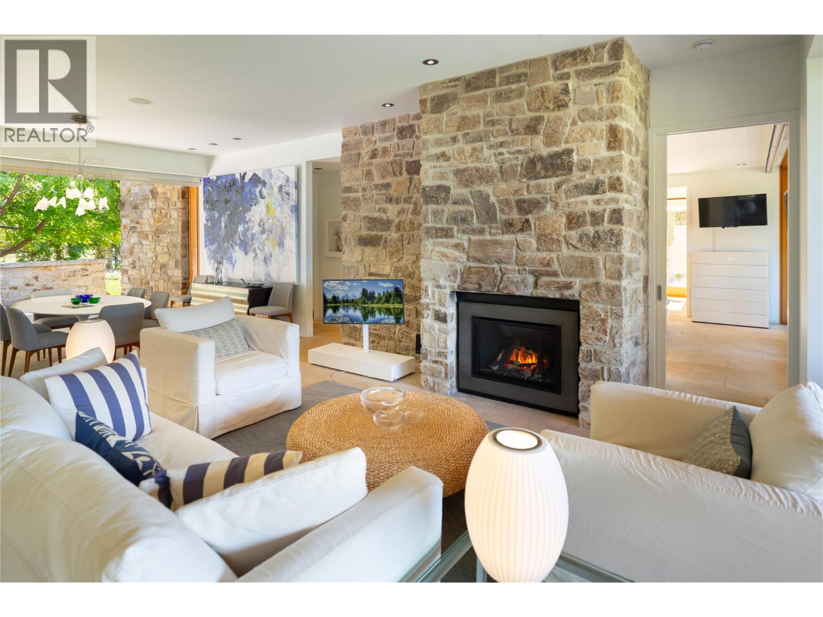 Beautiful unique waterfront home on the shores of Skaha Lake, offering 0.56 acres with a sandy beach and private dock. This contemporary residence captures timeless elegance in a premier lakefront setting. Award winning architect Cedric Burgers has designed a stunning residence which perfectly complements its surroundings, with extensive use of natural wood and stone. Architecturally designed with gorgeous and innovative features, the main level boasts fully pocketing doors which create a sensational blend of indoor & outdoor living, perfectly blending structure and nature including private dining areas on each side of the home. The kitchen features Wolf appliances, and further pocketing windows opening onto the exterior dining area. Open concept living and dining, with cozy stone gas fireplace. The primary bedroom features sensational lake views and a beautiful ensuite bathroom. Two more bedrooms and a full bath complete the main level. Downstairs is the family retreat, with games/media room, two more bedrooms, and full bathroom. Exceptional quality together with an impeccable choice of materials define this lakefront home. Many features include extensive natural stone detail, heated tile floors throughout, hot tub, and endless outdoor living spaces. The expansive backyard features lush landscaping for all the summer activities, blending perfectly with the architecture of the home. Secure gated entrance and oversized double garage, with workshop/storage & EV charger. Newly built dock with boat lift and storage for paddle boards and more. (id:47466)