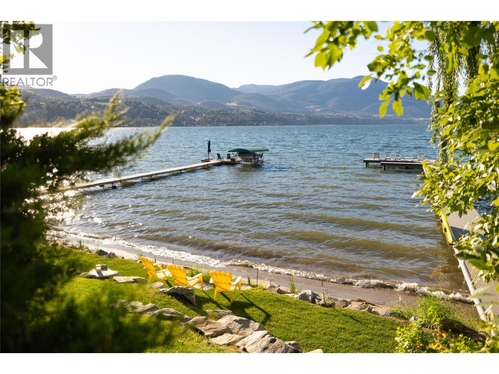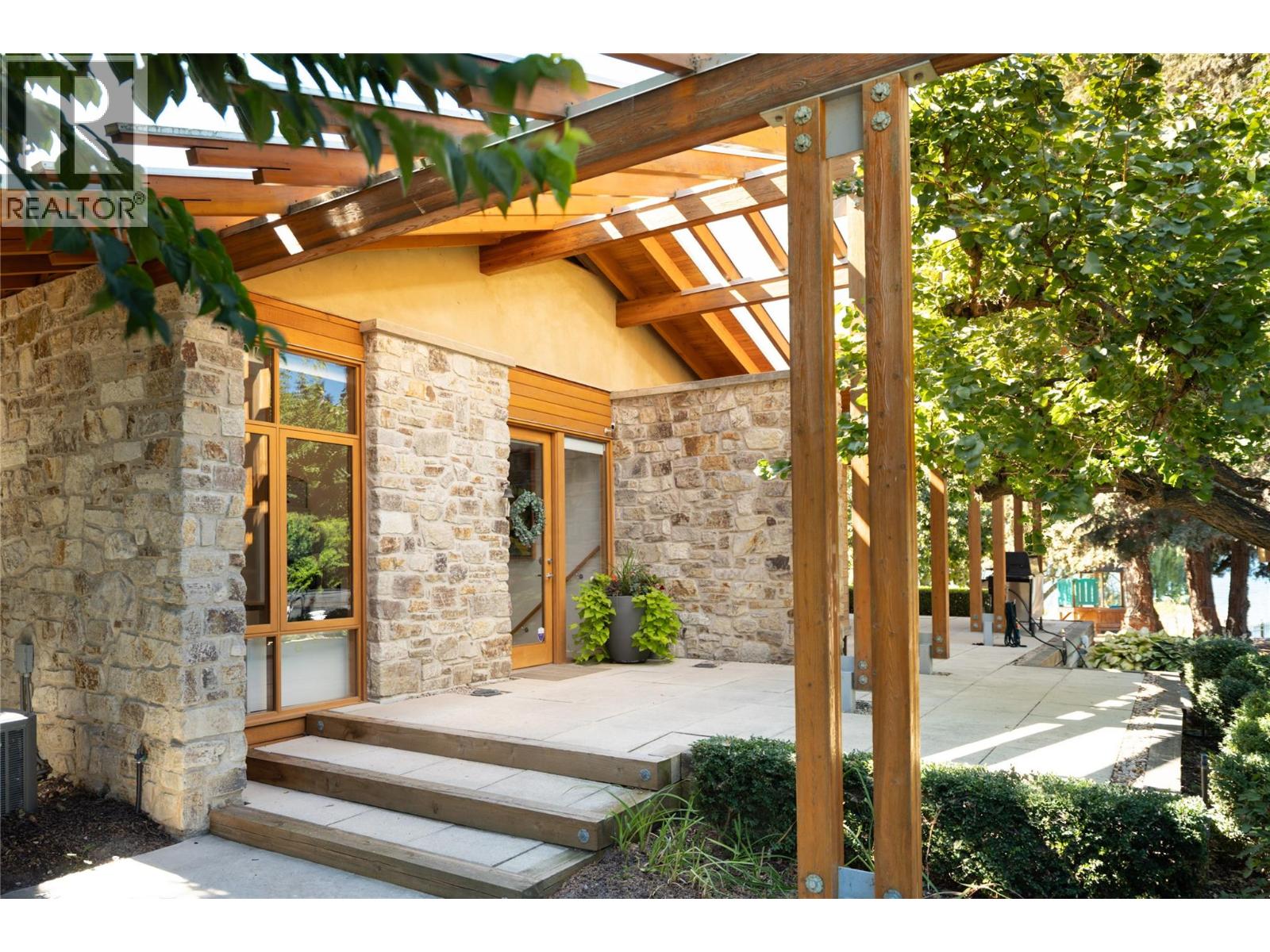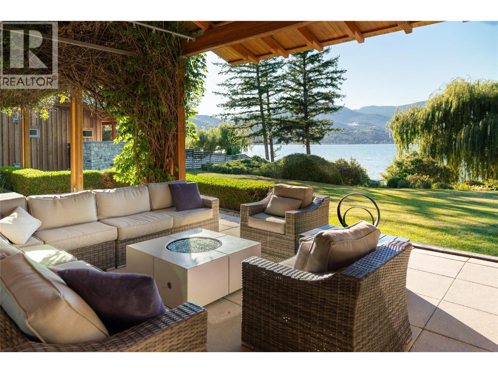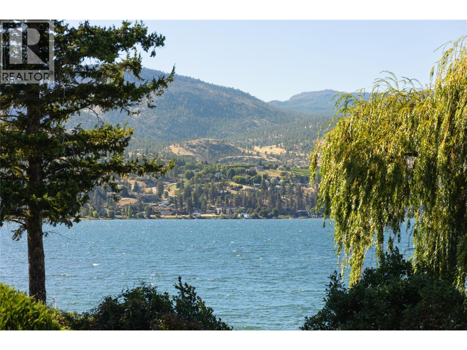 Beautiful unique waterfront home on the shores of Skaha Lake, offering 0.56 acres with a sandy beach and private dock. This contemporary residence captures timeless elegance in a premier lakefront setting. Award winning architect Cedric Burgers has designed a stunning residence which perfectly complements its surroundings, with extensive use of natural wood and stone. Architecturally designed with gorgeous and innovative features, the main level boasts fully pocketing doors which create a sensational blend of indoor & outdoor living, perfectly blending structure and nature including private dining areas on each side of the home. The kitchen features Wolf appliances, and further pocketing windows opening onto the exterior dining area. Open concept living and dining, with cozy stone gas fireplace. The primary bedroom features sensational lake views and a beautiful ensuite bathroom. Two more bedrooms and a full bath complete the main level. Downstairs is the family retreat, with games/media room, two more bedrooms, and full bathroom. Exceptional quality together with an impeccable choice of materials define this lakefront home. Many features include extensive natural stone detail, heated tile floors throughout, hot tub, and endless outdoor living spaces. The expansive backyard features lush landscaping for all the summer activities, blending perfectly with the architecture of the home. Secure gated entrance and oversized double garage, with workshop/storage & EV charger. Newly built dock with boat lift and storage for paddle boards and more. (id:47466)