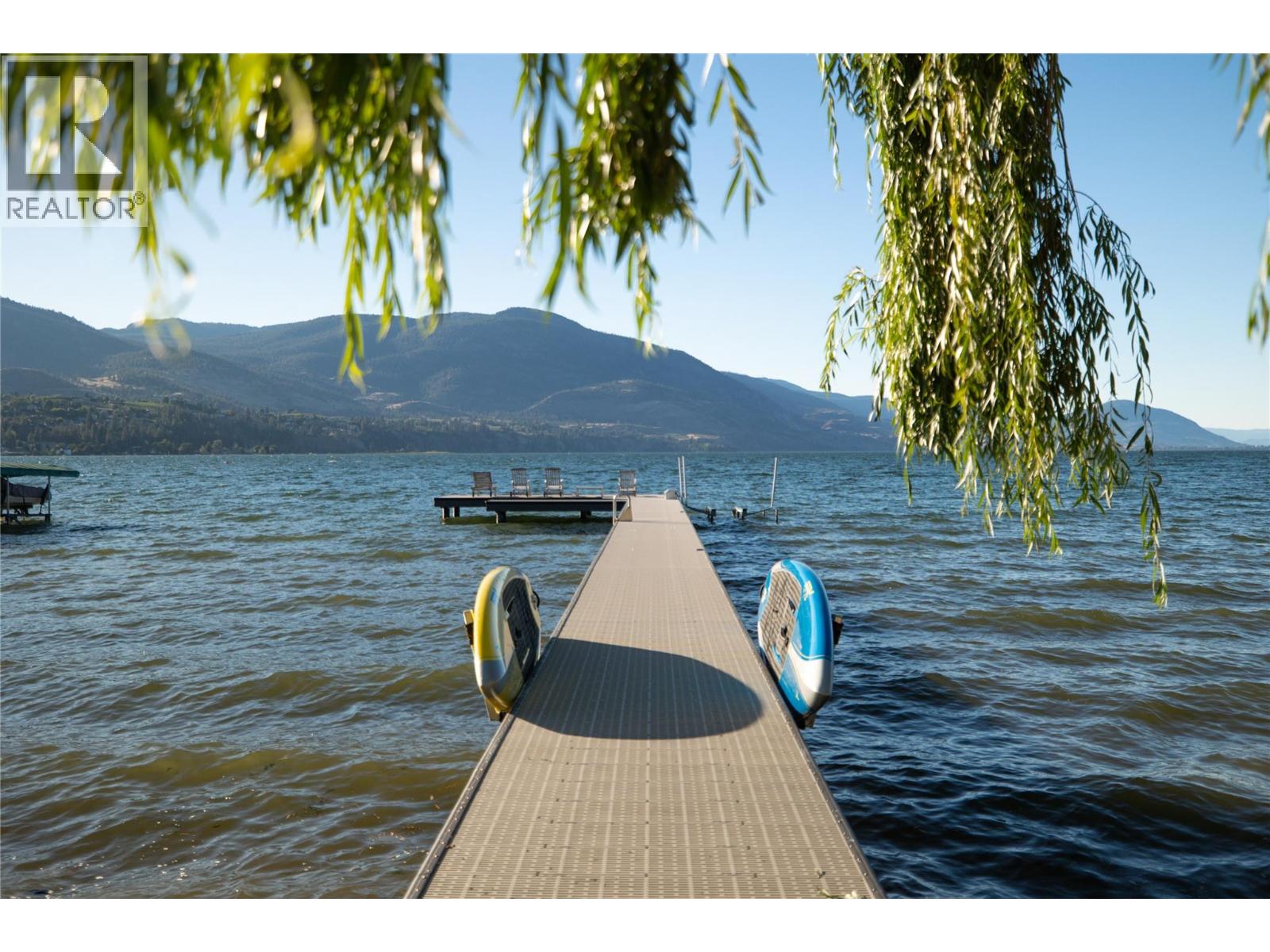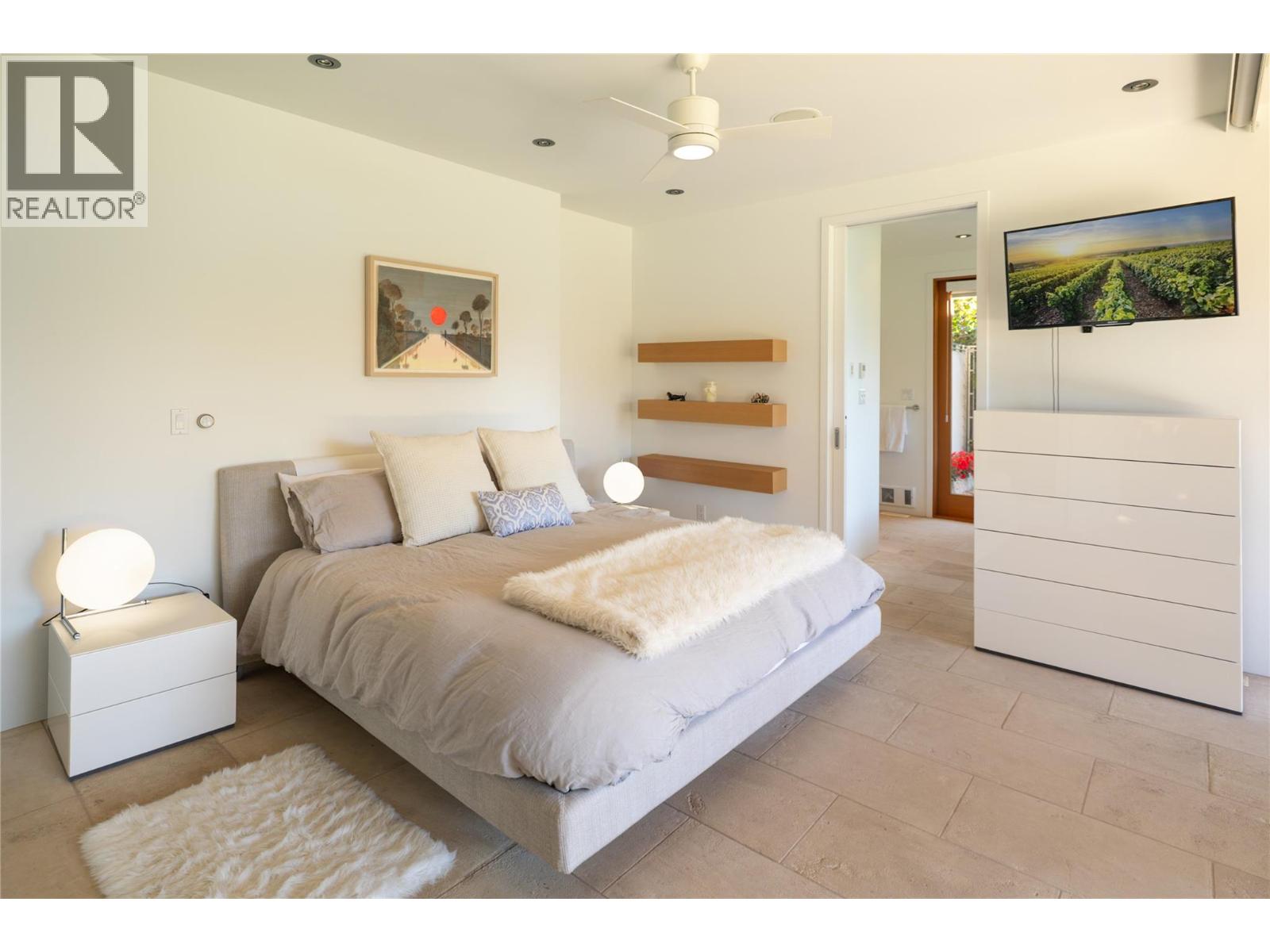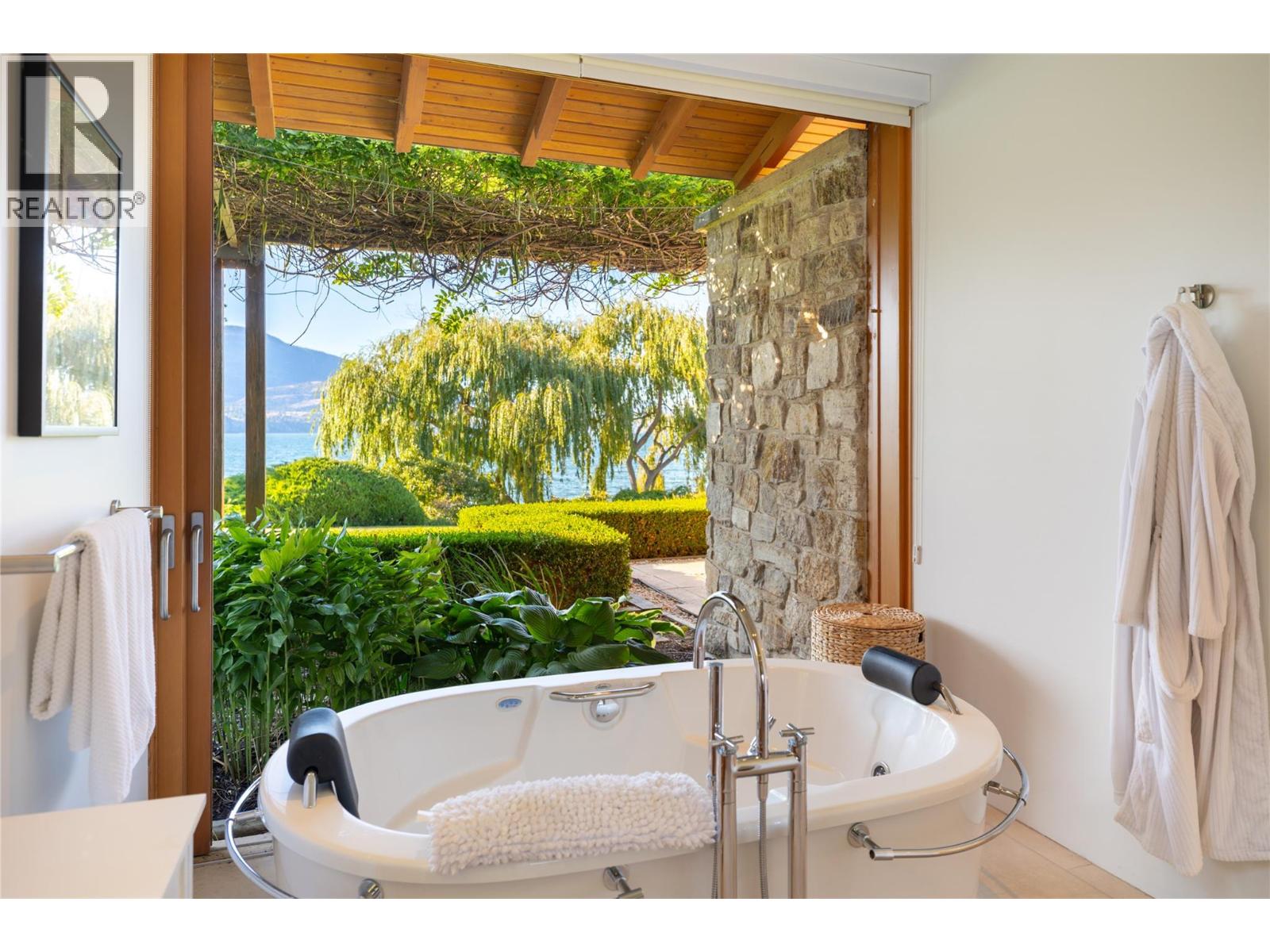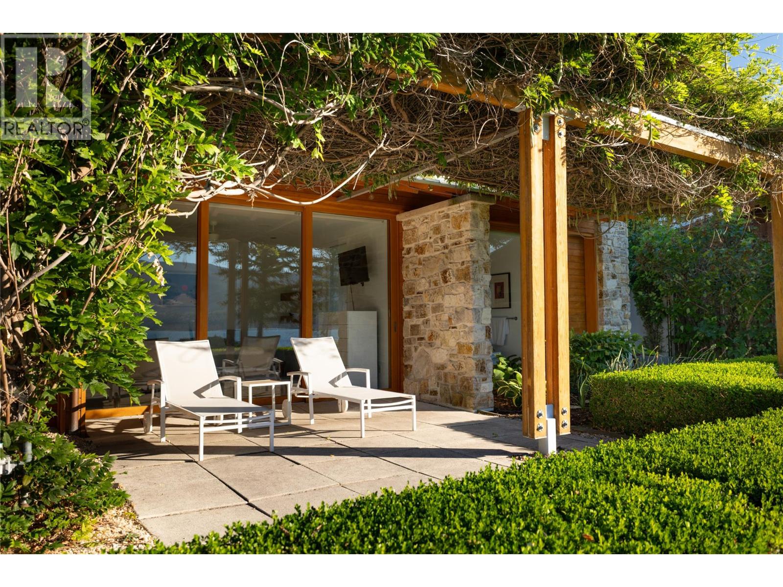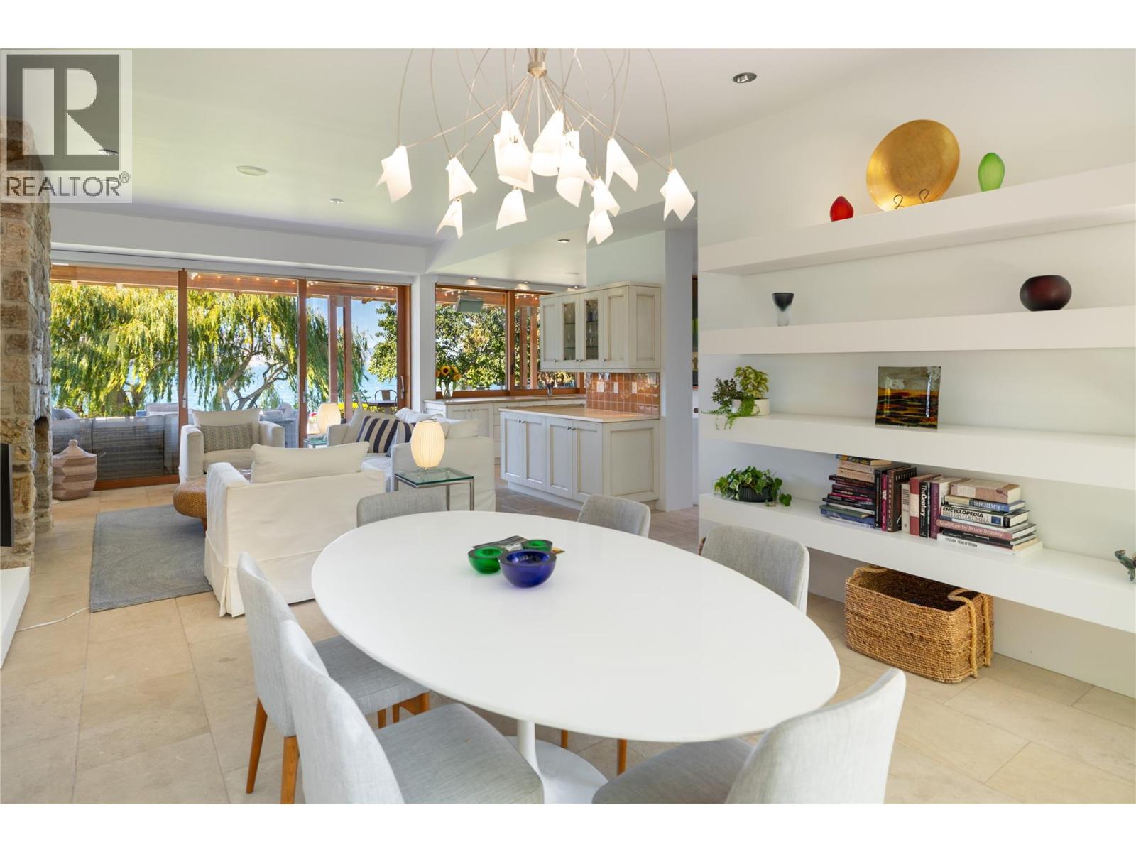 Beautiful unique waterfront home on the shores of Skaha Lake, offering 0.56 acres with a sandy beach and private dock. This contemporary residence captures timeless elegance in a premier lakefront setting. Award winning architect Cedric Burgers has designed a stunning residence which perfectly complements its surroundings, with extensive use of natural wood and stone. Architecturally designed with gorgeous and innovative features, the main level boasts fully pocketing doors which create a sensational blend of indoor & outdoor living, perfectly blending structure and nature including private dining areas on each side of the home. The kitchen features Wolf appliances, and further pocketing windows opening onto the exterior dining area. Open concept living and dining, with cozy stone gas fireplace. The primary bedroom features sensational lake views and a beautiful ensuite bathroom. Two more bedrooms and a full bath complete the main level. Downstairs is the family retreat, with games/media room, two more bedrooms, and full bathroom. Exceptional quality together with an impeccable choice of materials define this lakefront home. Many features include extensive natural stone detail, heated tile floors throughout, hot tub, and endless outdoor living spaces. The expansive backyard features lush landscaping for all the summer activities, blending perfectly with the architecture of the home. Secure gated entrance and oversized double garage, with workshop/storage & EV charger. Newly built dock with boat lift and storage for paddle boards and more. (id:47466)