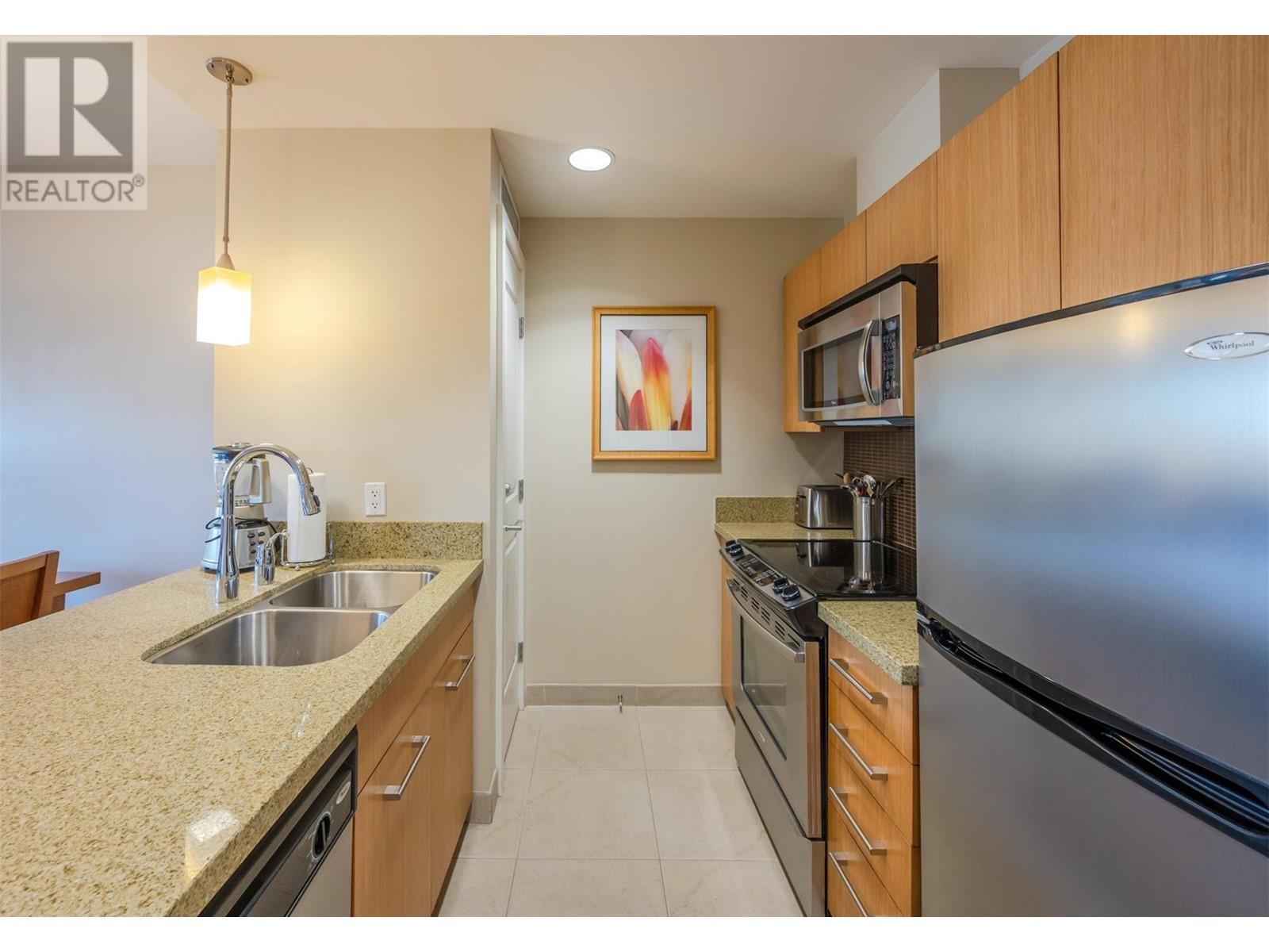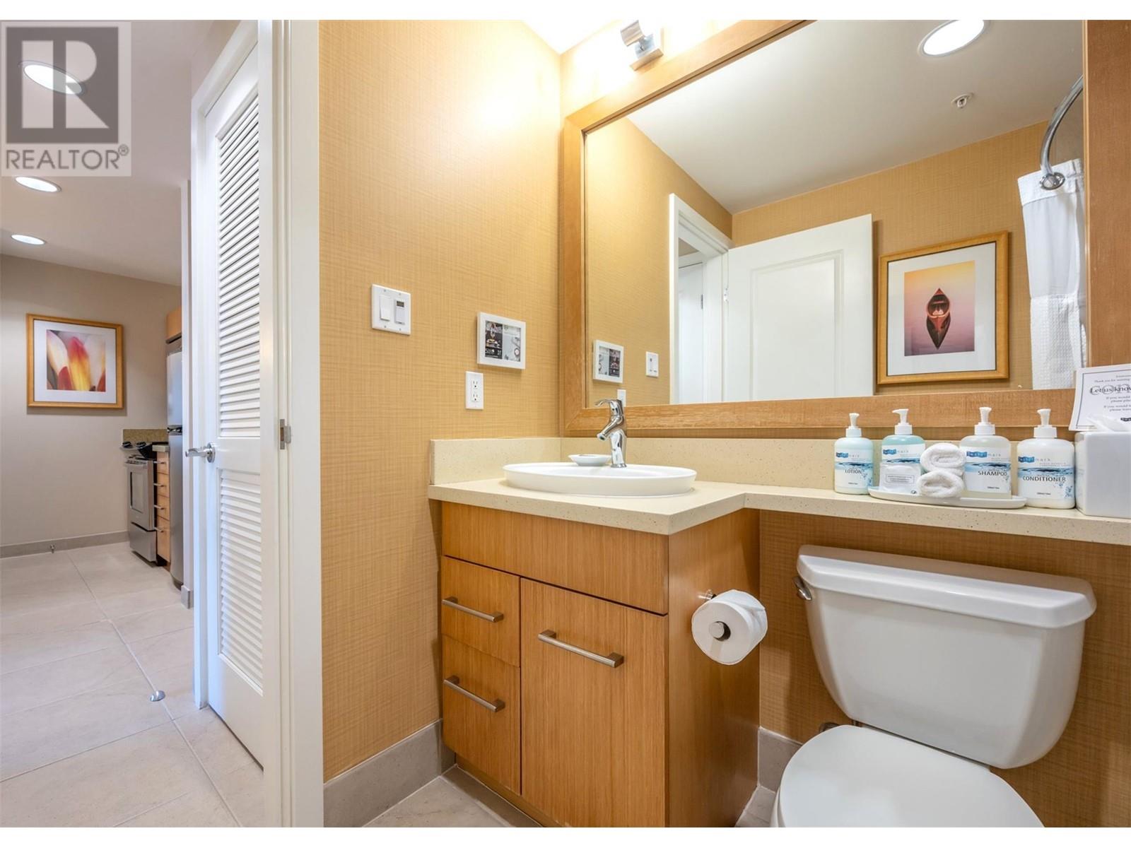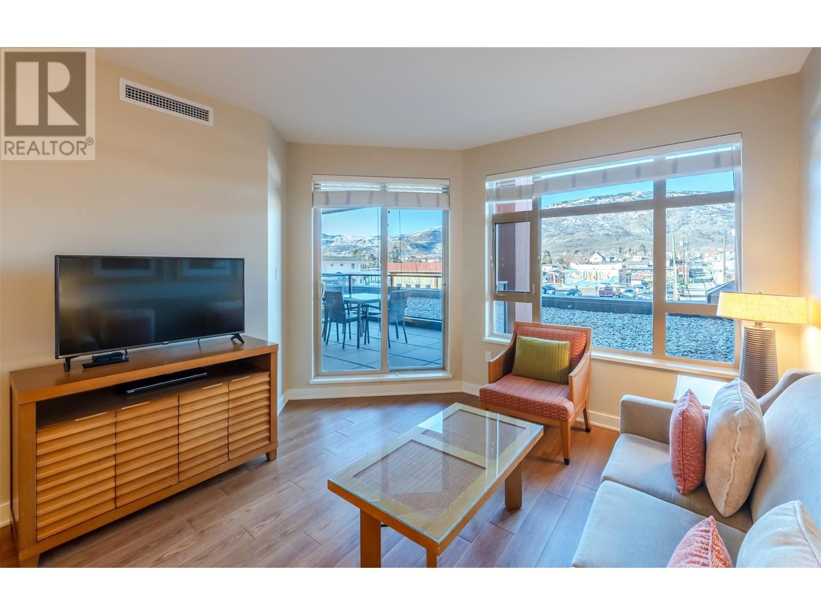 Welcome affordable vacation ownership in Canada's desert paradise! This 1/12th fractional interest allows stress-free, lock and leave vacation property ownership, with exclusive access four weeks per year, one in each season. On the quiet, west facing side of the resort with town and mountain views, this 600 square foot unit has loads of natural light, and a sliding door walk-out to your spacious, sheltered terrace ideal for alfresco dining and stunning sunset views. The well appointed kitchen overlooks your open concept living/dining area, ideal for entertaining. The spacious bedroom is luxuriously appointed with a king sized bed to ensure restful sleep, and the bathroom features a deep soaker tub/shower combo and generous vanity . Close proximity to elevator and stairs ensures quick access to the beach, pool deck, and secure, indoor parking. Watermark resort amenities include pool, hot tubs (one year round), gym, spa, and beautiful function rooms. Onsite dining options include 15 Park Bistro (with seasonal patio and grill), Boston Pizza, Backroads Brewery, ands Roberto's Gelato. Located just steps to all the vibrant shops, services and amazing dining options Osoyoos has to offer; world class wineries, dining, golf, skiing, watersports and cultural experiences are all in close proximity. Enrollment in professionally managed rental pool can offset ownership costs with rental income when not in use. Subject to GST. Sq ft per builder plans. Buyer to verify if important. (id:47466)