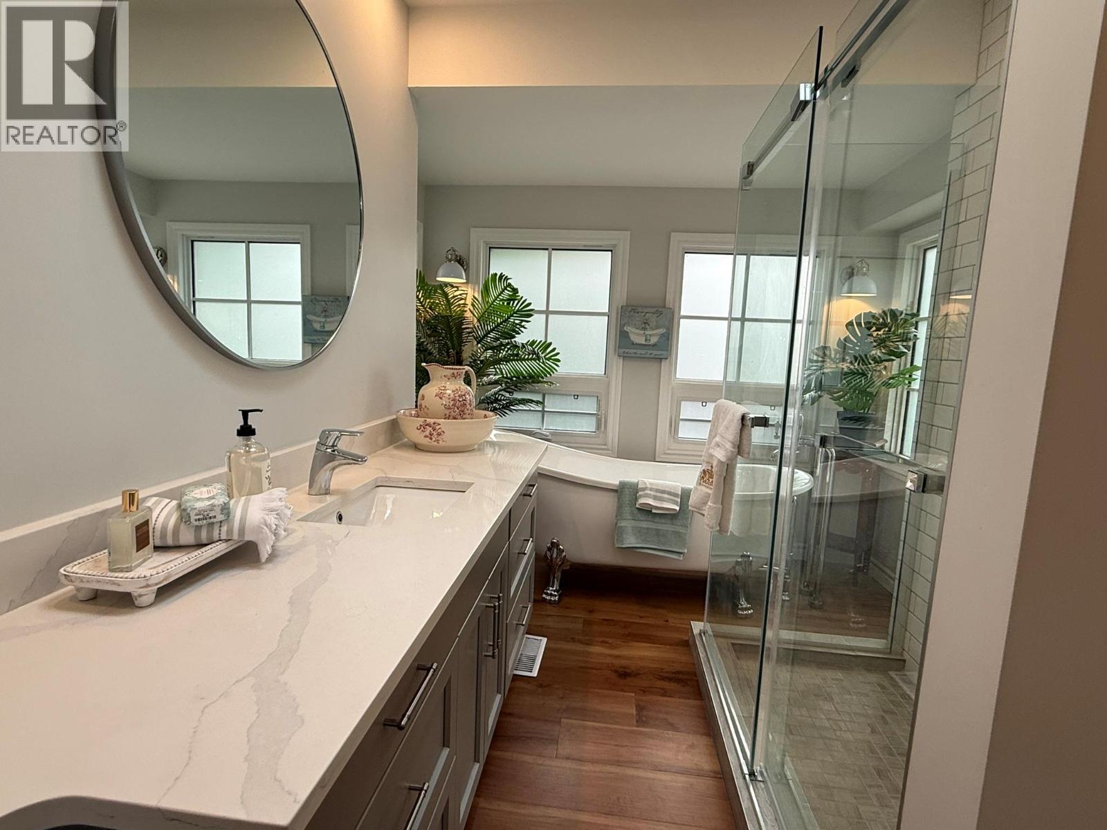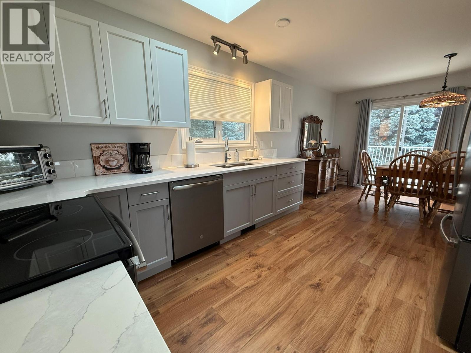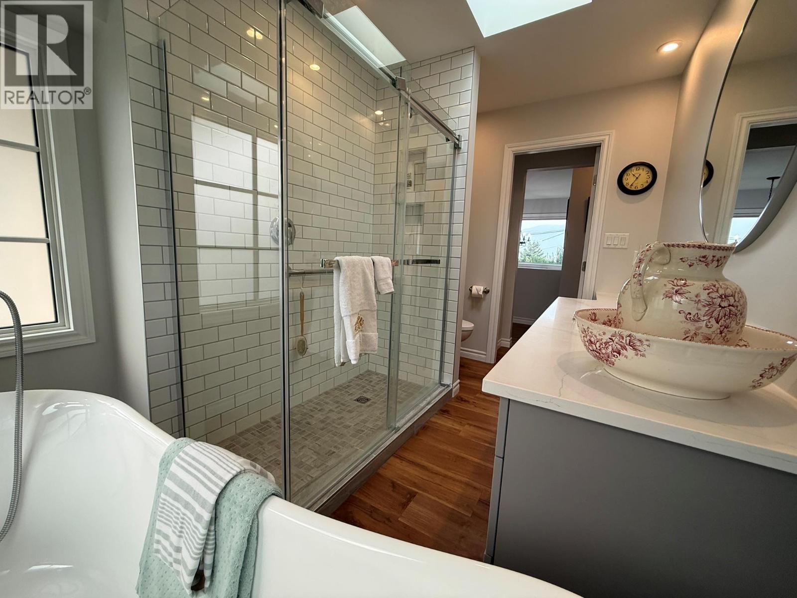 Stylish 3-Bedroom, 3-Bath Home with Stunning City & Valley Views. Tucked away on a quiet cul-de-sac, this beautifully updated home offers breathtaking city and valley views from both the main living space and upper deck. The upper level has been fully renovated and features a modern kitchen with quartz countertops, a beautifully designed bathroom with a claw-foot tub and a large tiled walk-in shower, and durable vinyl plank flooring throughout. Step out from the dining area onto a spacious deck—perfect for morning coffee or evening entertaining—all while enjoying the panoramic views. The private, fully fenced yard is surrounded by mature trees and includes multiple decks and three storage sheds for all your needs. The lower level includes a generously sized bedroom with ensuite, a large rec room, a powder room, and a spacious laundry/storage area. The single carport has been enclosed for added functionality. A rare combination of style, space, and scenery—this home is move-in ready! (id:47466)