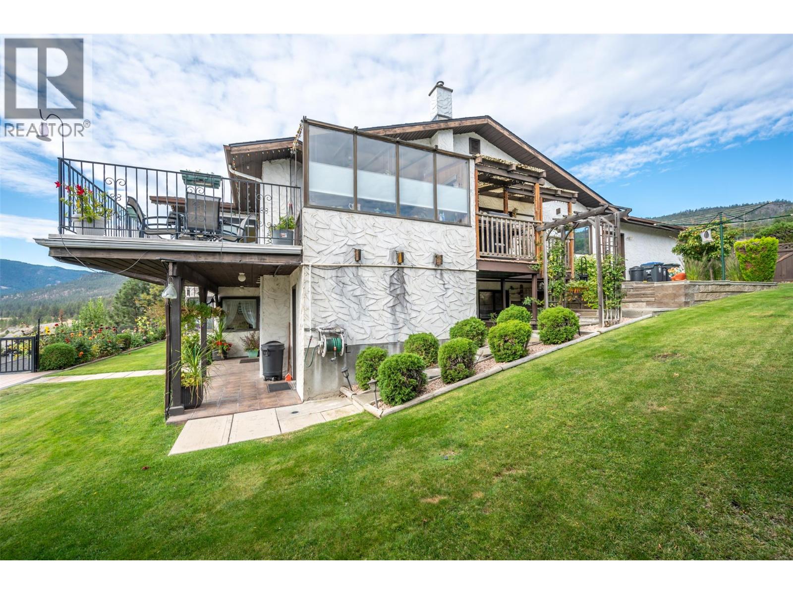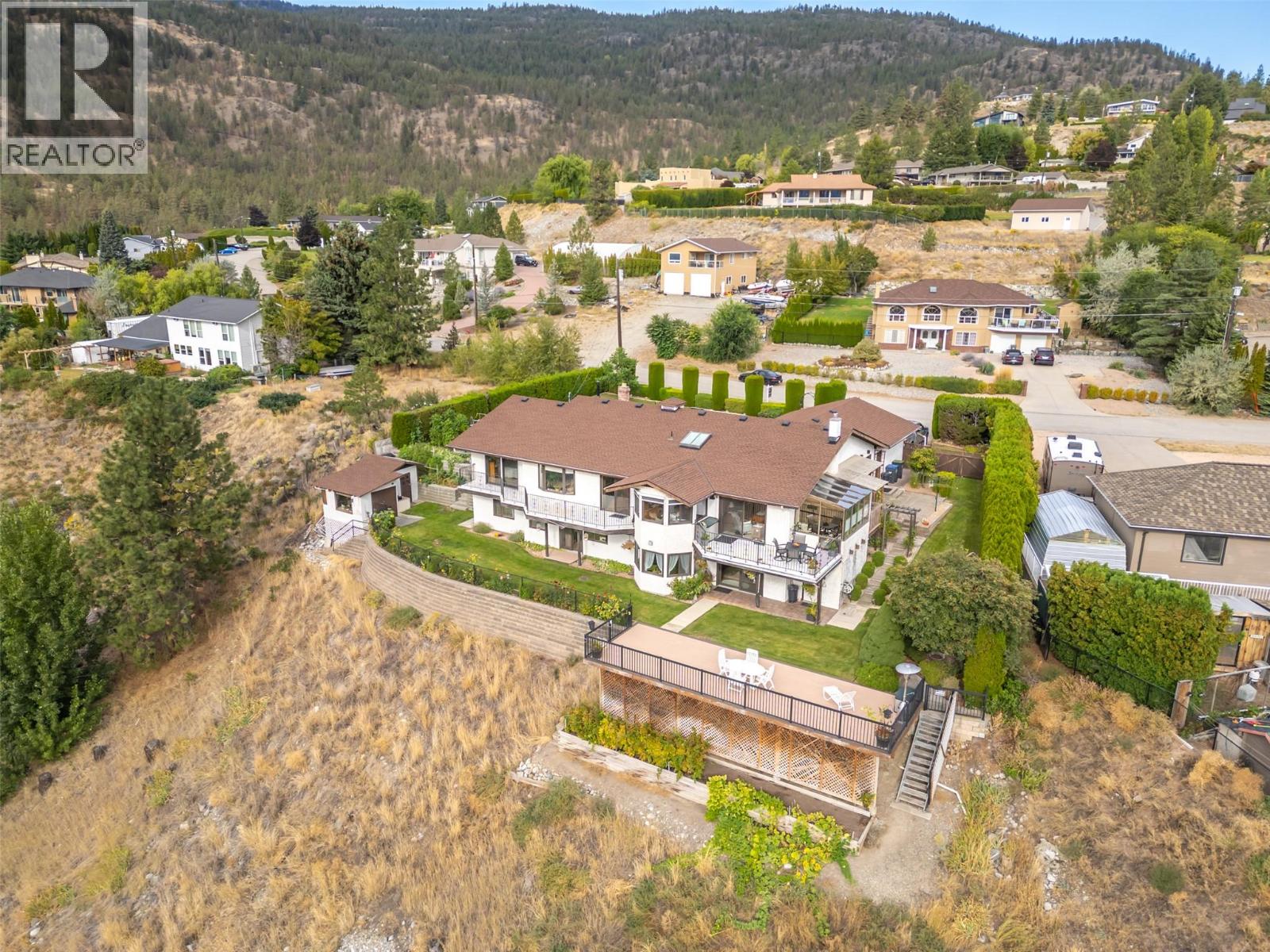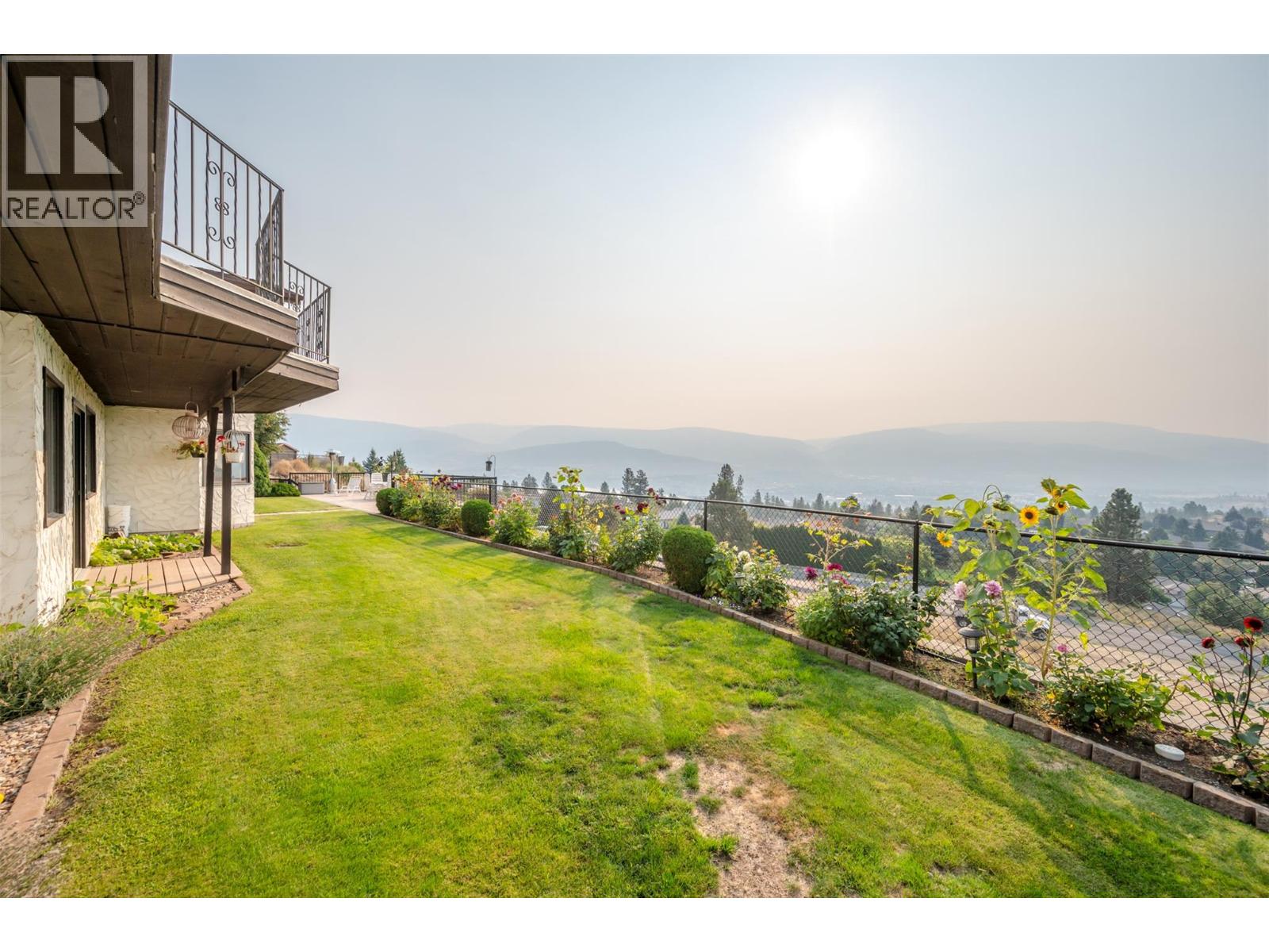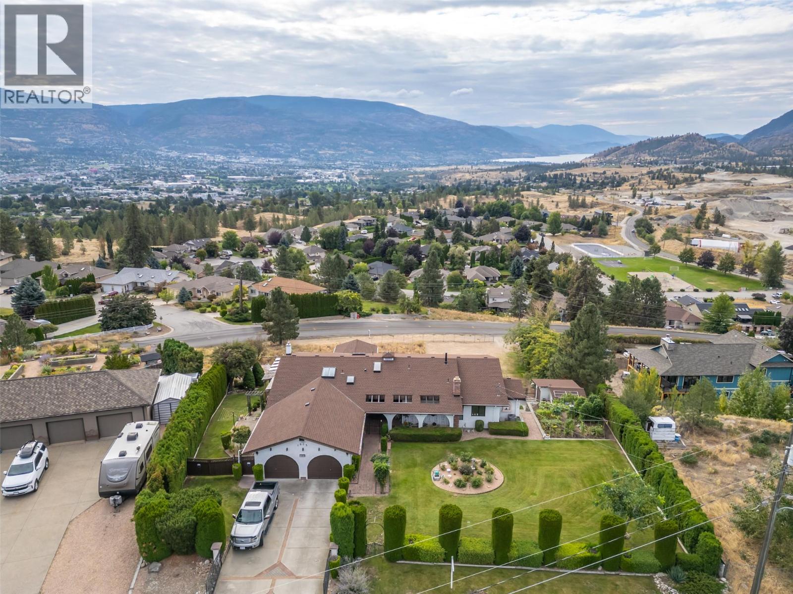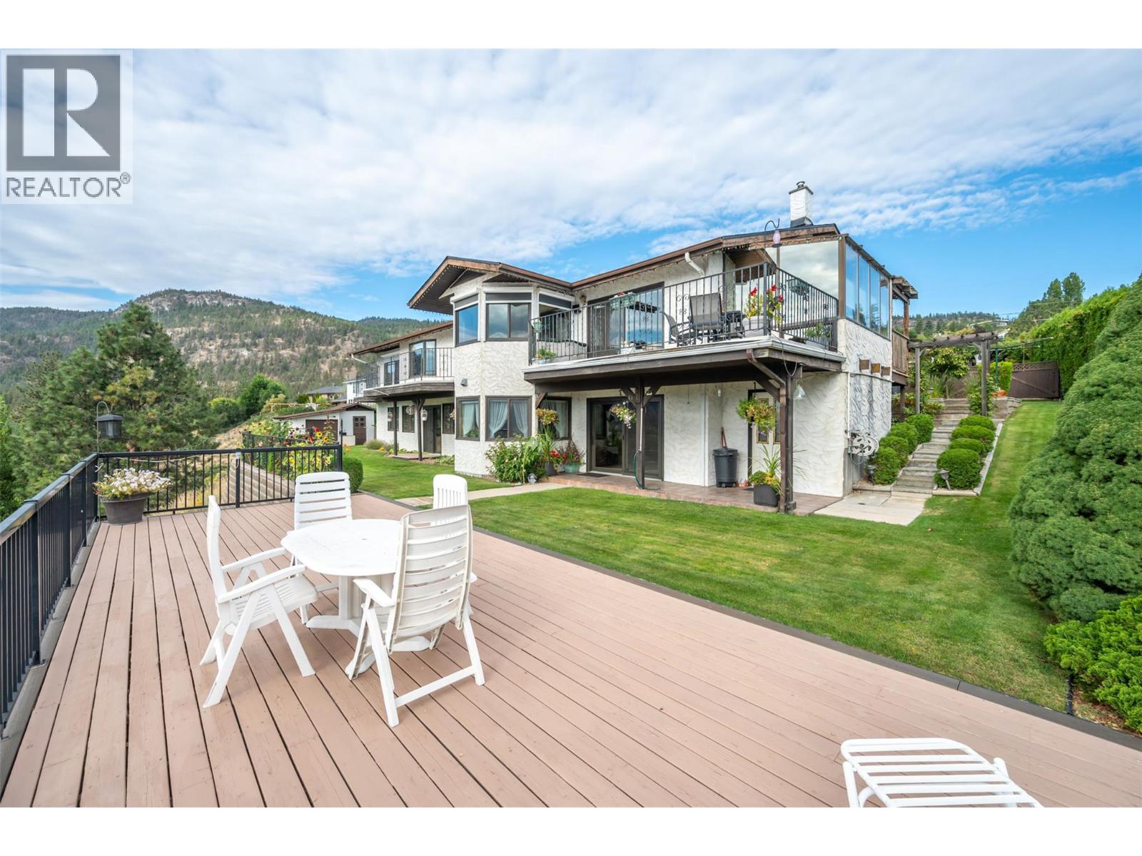 Welcome to your private estate perched high above Penticton, where breathtaking panoramic views of both Skaha and Okanagan Lake create an unforgettable backdrop - all just 3 minutes from town. This executive walk-out rancher sits on a full acre of park-like grounds with manicured hedges, a gated driveway, and endless possibilities on the lower tier of the property. This home has been meticulously maintained over the years with many updates throughout. Inside, soaring vaulted ceilings with exposed beams, engineered hardwood, and custom octagon tile create timeless character. The main floor offers 3 beds, 3 baths, an office, sunroom, and a bright family room with a wall of windows. The expansive kitchen and breakfast nook showcase stunning valley views through bay windows, while the formal dining room is ideal for hosting family gatherings. The primary suite is a true retreat with dual vanities, wic, hot tub, and direct access to the balcony. Downstairs, a summer kitchen opens to a sweeping rec room, the perfect space for the kids to play or to host extravagant parties! Along with 2 more beds, full bath with sauna, wine room, and a large workshop for hobbyists. Multiple balconies and a massive deck ensure you’ll never miss a sunset over the valley. A spacious double-car garage with extra storage adds both convenience and functionality. With its unmatched views, timeless architecture, and extraordinary lot, this is a one-of-a-kind estate! (id:47466)