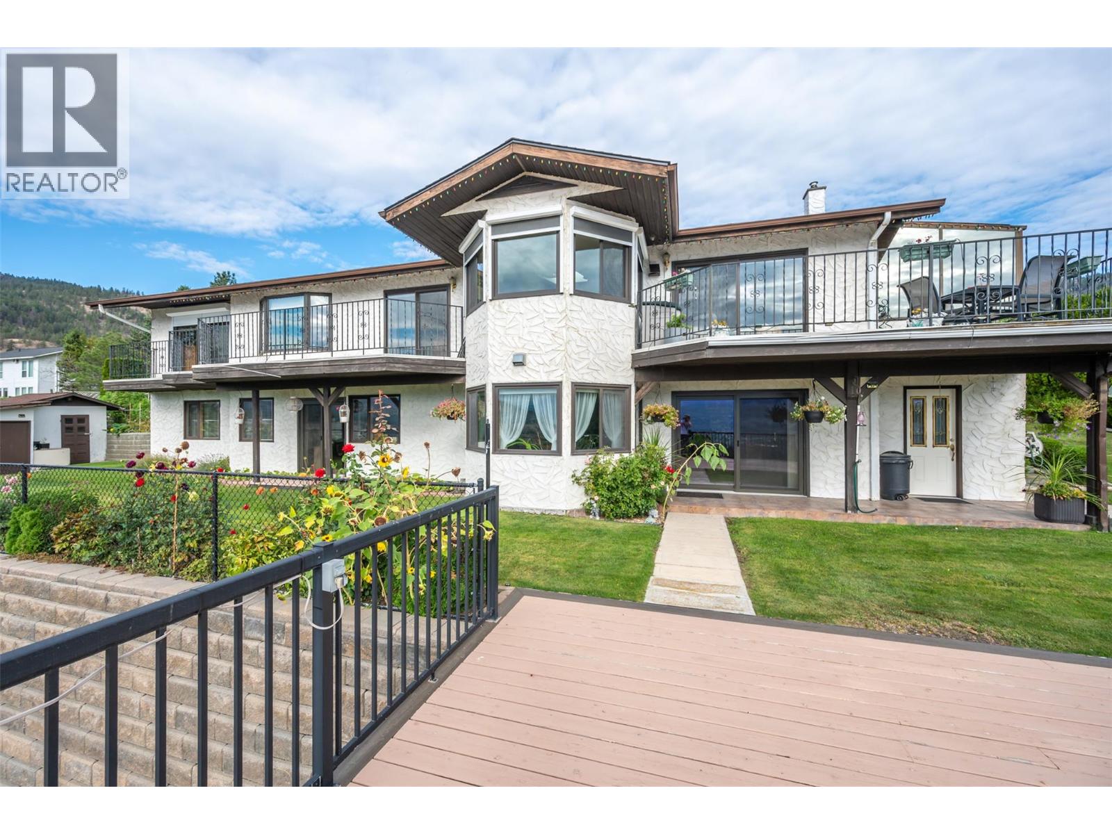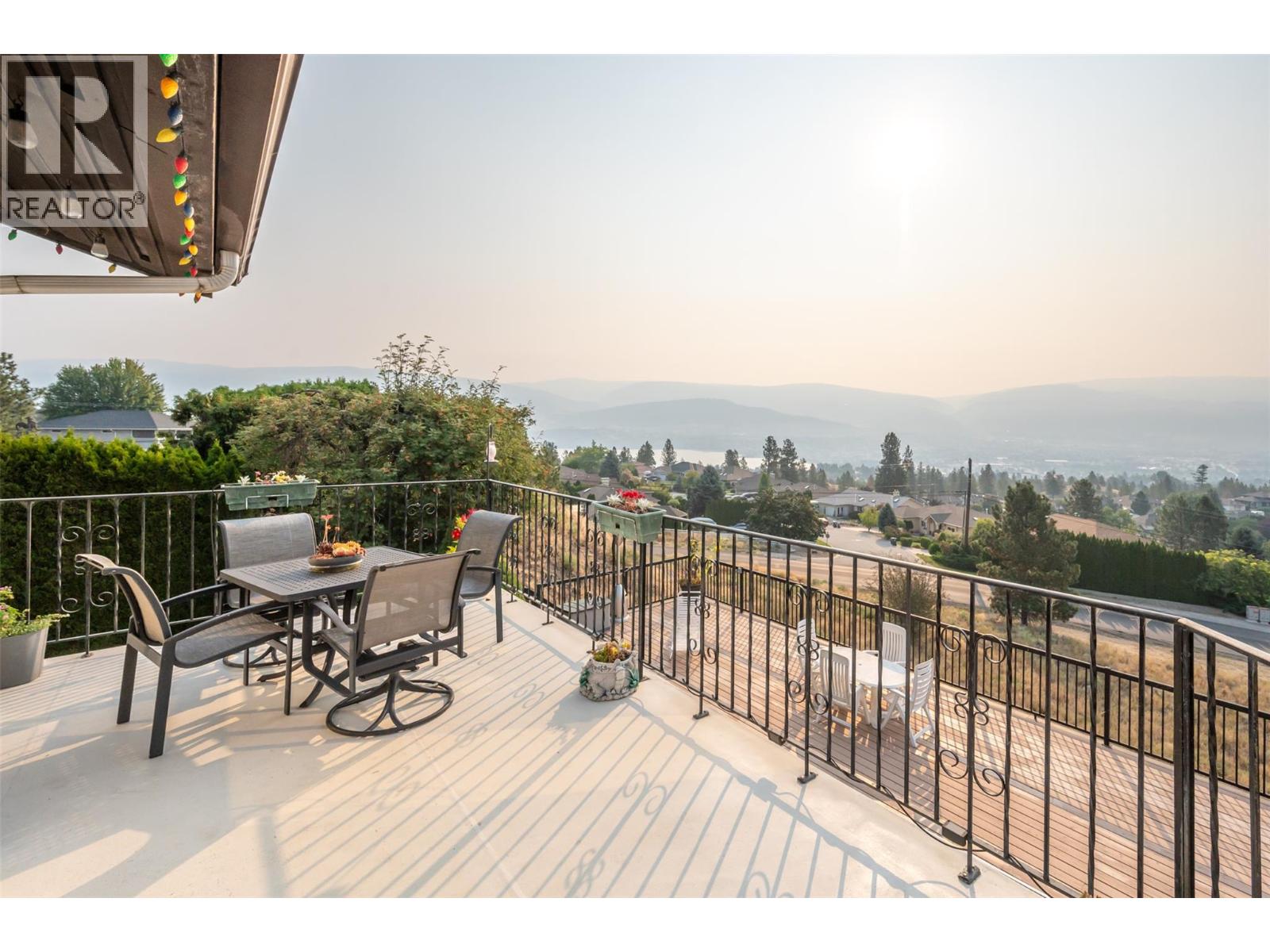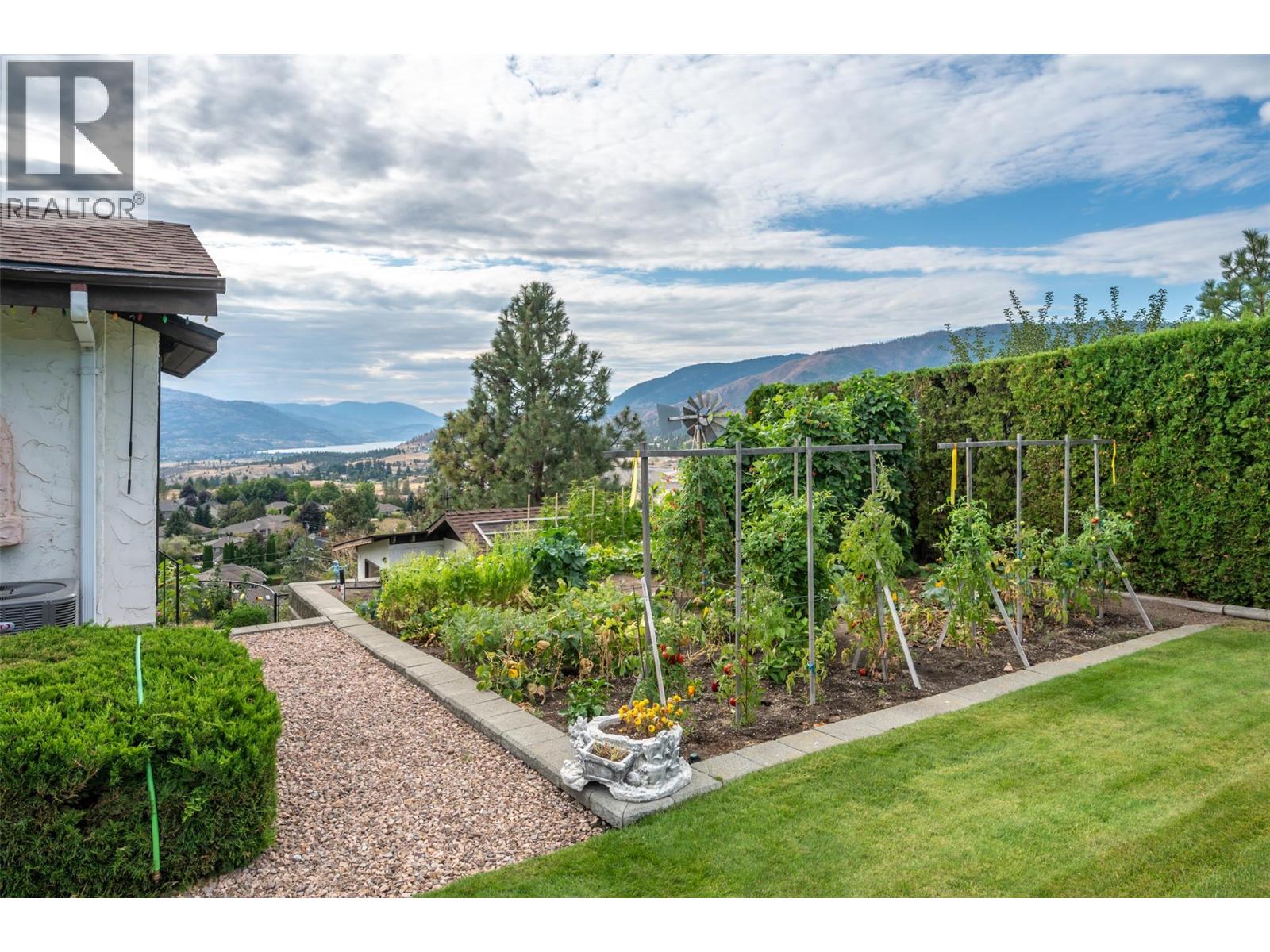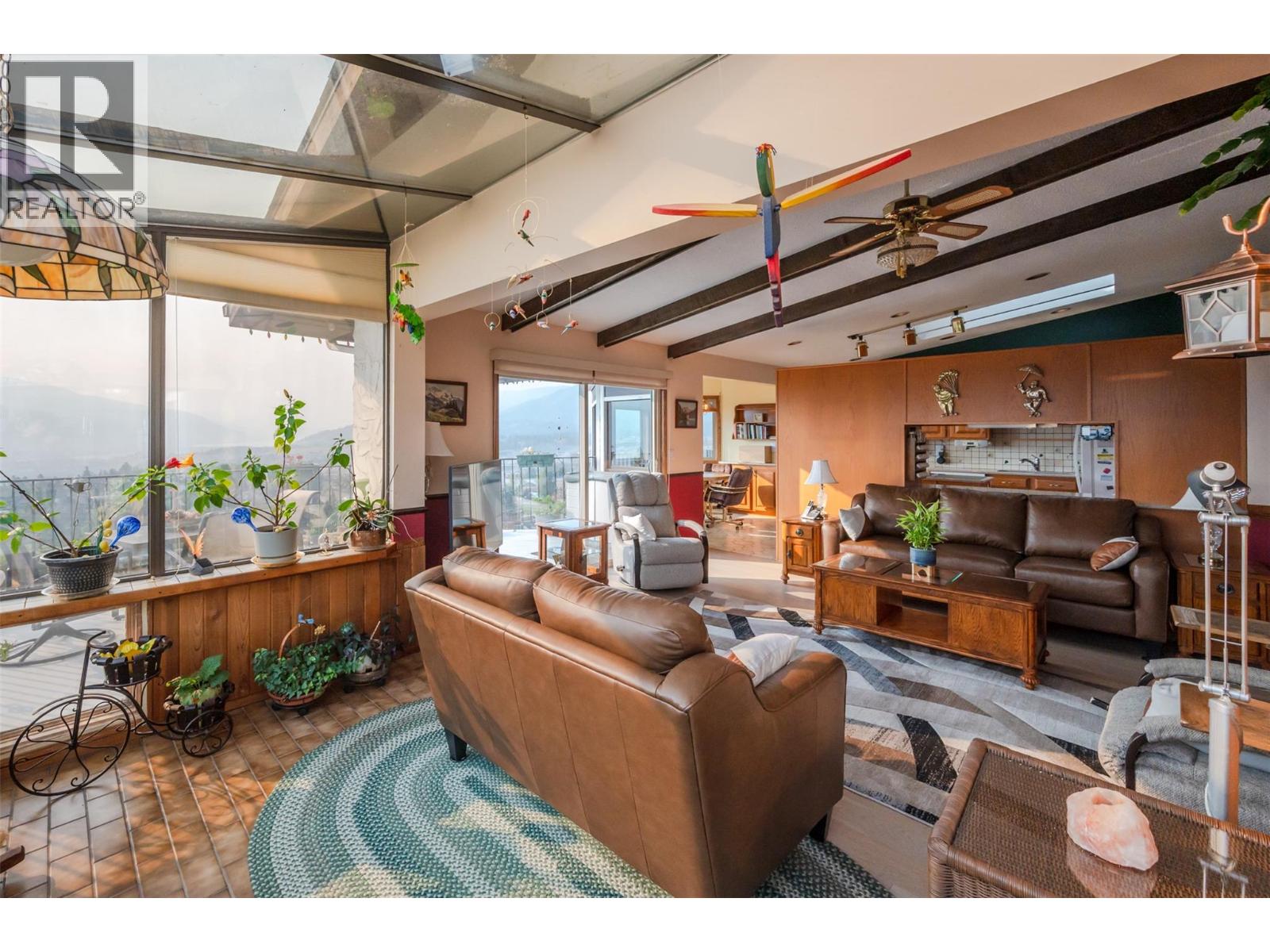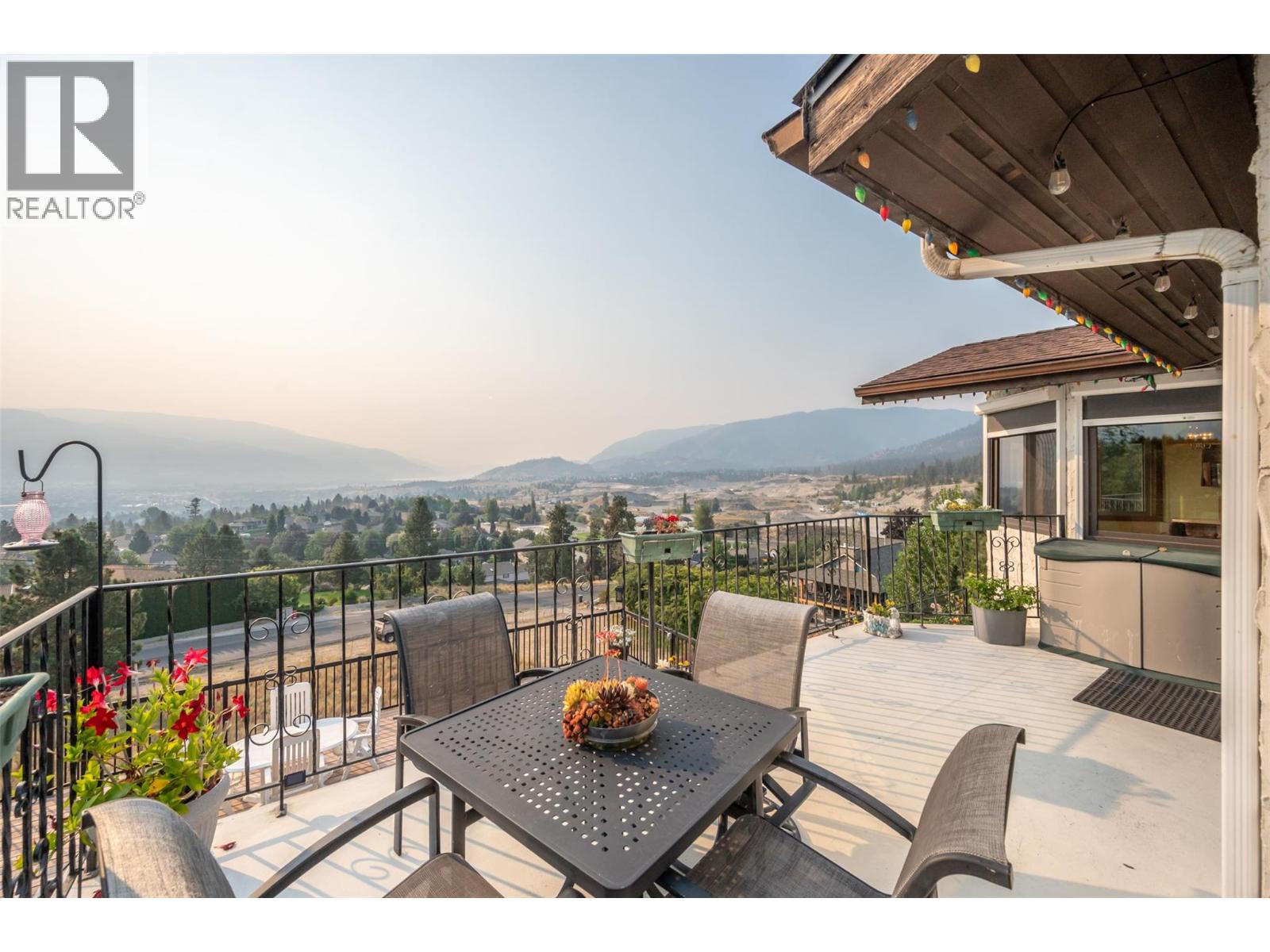 Welcome to your private estate perched high above Penticton, where breathtaking panoramic views of both Skaha and Okanagan Lake create an unforgettable backdrop - all just 3 minutes from town. This executive walk-out rancher sits on a full acre of park-like grounds with manicured hedges, a gated driveway, and endless possibilities on the lower tier of the property. This home has been meticulously maintained over the years with many updates throughout. Inside, soaring vaulted ceilings with exposed beams, engineered hardwood, and custom octagon tile create timeless character. The main floor offers 3 beds, 3 baths, an office, sunroom, and a bright family room with a wall of windows. The expansive kitchen and breakfast nook showcase stunning valley views through bay windows, while the formal dining room is ideal for hosting family gatherings. The primary suite is a true retreat with dual vanities, wic, hot tub, and direct access to the balcony. Downstairs, a summer kitchen opens to a sweeping rec room, the perfect space for the kids to play or to host extravagant parties! Along with 2 more beds, full bath with sauna, wine room, and a large workshop for hobbyists. Multiple balconies and a massive deck ensure you’ll never miss a sunset over the valley. A spacious double-car garage with extra storage adds both convenience and functionality. With its unmatched views, timeless architecture, and extraordinary lot, this is a one-of-a-kind estate! (id:47466)