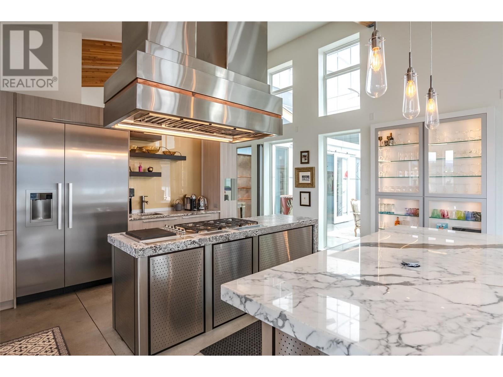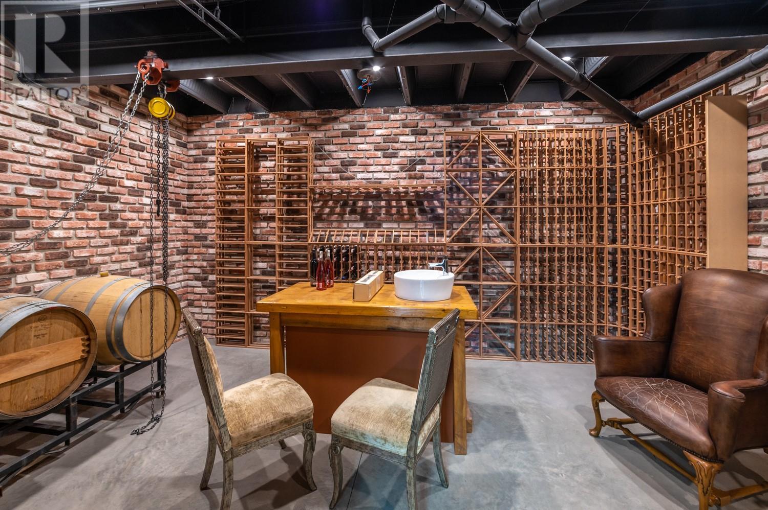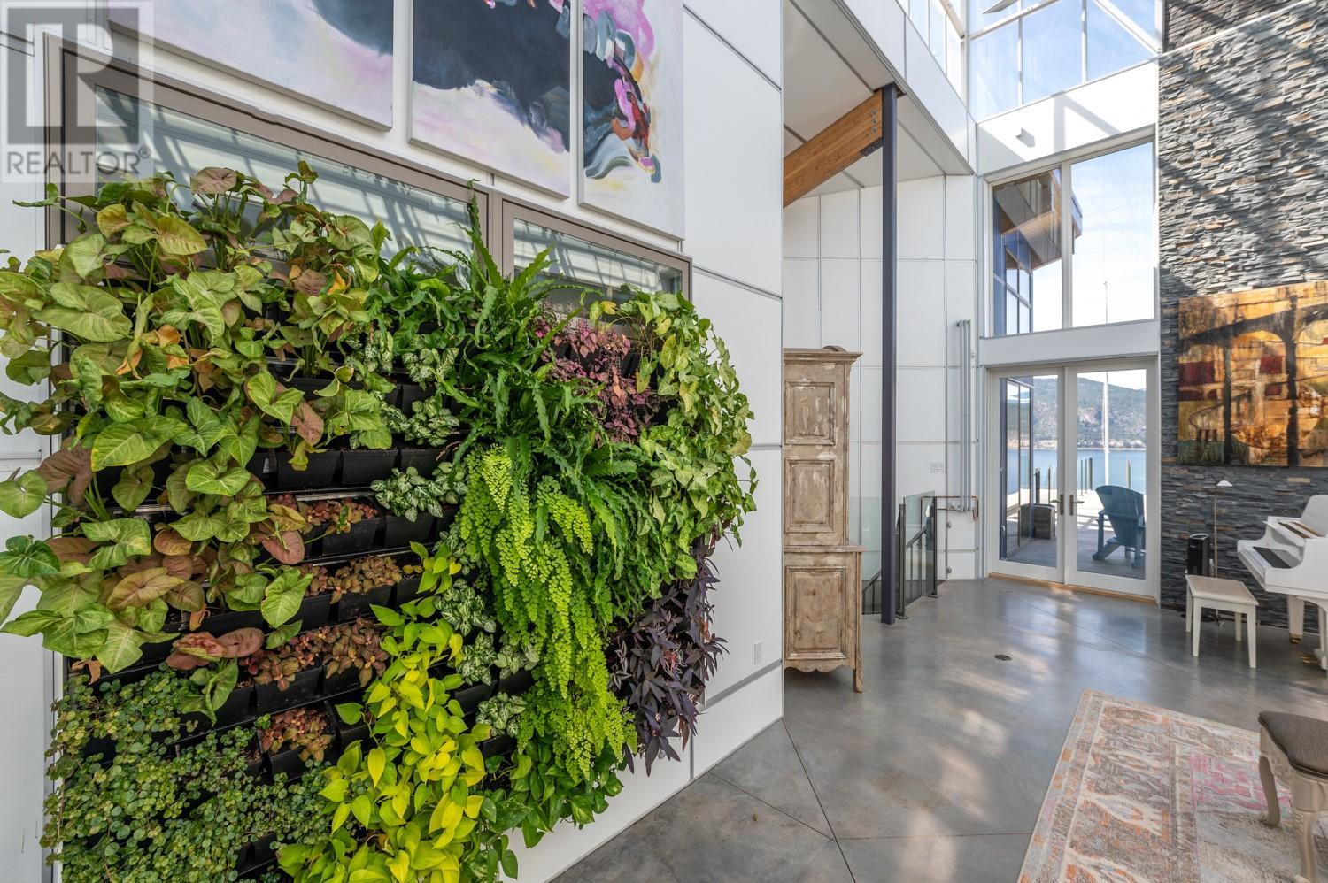 Welcome to 2185 Naramata Road, a paradise of mesmerizing beauty and abundant wildlife. This one-of-a-kind waterfront property boasts sweeping lake and land views and showcases a distinctive, luxurious architectural masterpiece. Step into the foyer and living areas that open onto a breathtaking atrium, perfect for year-round gardening, hosting events, or finding personal inspiration. The living spaces, atrium, and master bedroom all lead to a completely private infinity pool and patio, accessible only from the house. The property features polished concrete floors throughout, a customized heating/cooling system, and extensive solar panels, contributing to remarkable energy efficiency. The house can be fully off-grid if desired. Each ensuite bedroom includes a sink, fridge, and outdoor access, offering potential rental income opportunities. The custom kitchen is a culinary delight, equipped with top-of-the-line stainless steel appliances, double ovens, a six-burner stove with a grill, and two islands. Take your elevator to the lower level, which includes a secondary kitchen with walk-in fridge/ freezer, an extraordinary wine cellar & tasting bar, workshop/storage & large office. The property’s Merlot grapes are sold to local wineries, generating income and farm status. A secondary building on the property is designed for wine production and can be converted into two rental suites, presenting enormous potential for rental income with no restrictions. (id:47466)