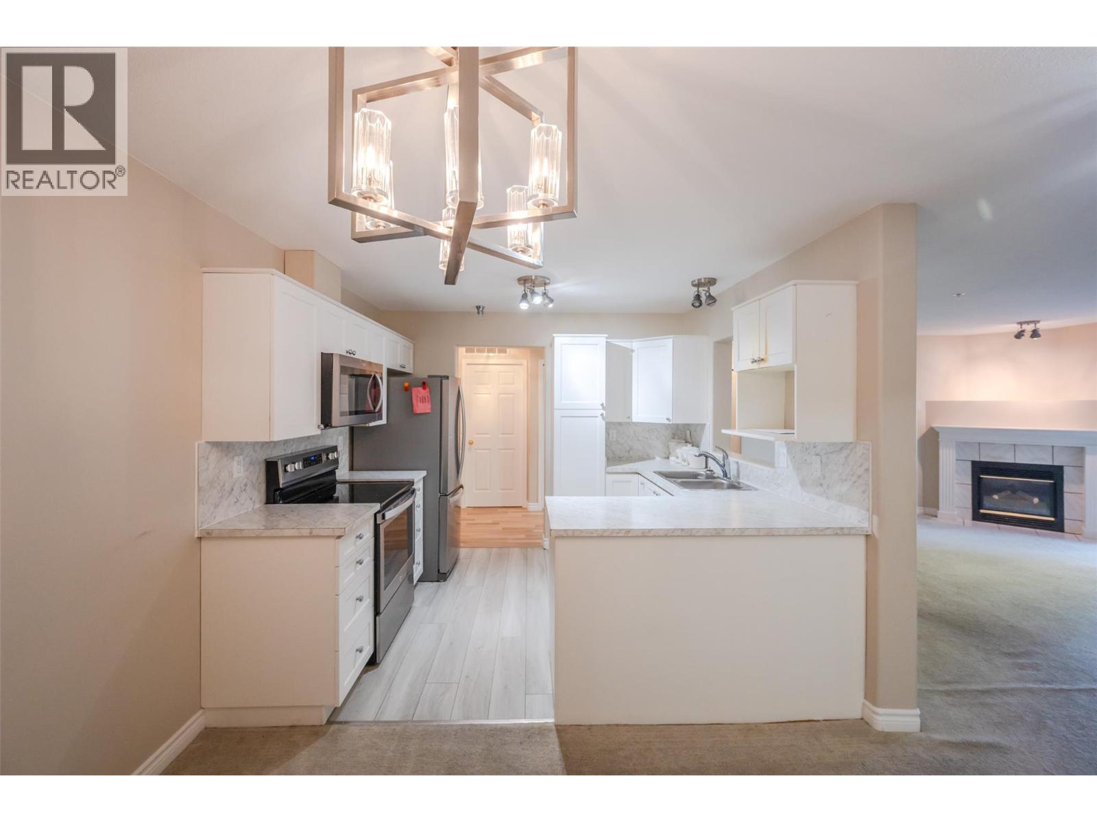 Cherry Lane Towers – A well-built concrete and steel 55+ complex, ideally located just steps from Cherry Lane Mall, offering easy access to banking, grocery stores, pharmacies, and more. Public transit and bike lanes are right outside the building. This bright 2nd-floor unit features 2 bedrooms and 2 bathrooms, with quick possession available. The recently updated kitchen sits next to a formal dining room, perfect for entertaining. The primary bedroom includes two closets and a full 4-piece ensuite, while the second bedroom is conveniently located near the second bathroom. The spacious living room has a cozy gas fireplace and opens onto a private, covered north-facing deck. Amenities include one secure underground parking stall, storage lockers, and a community room with a variety of activities. Pets are welcome with restrictions. (id:47466)