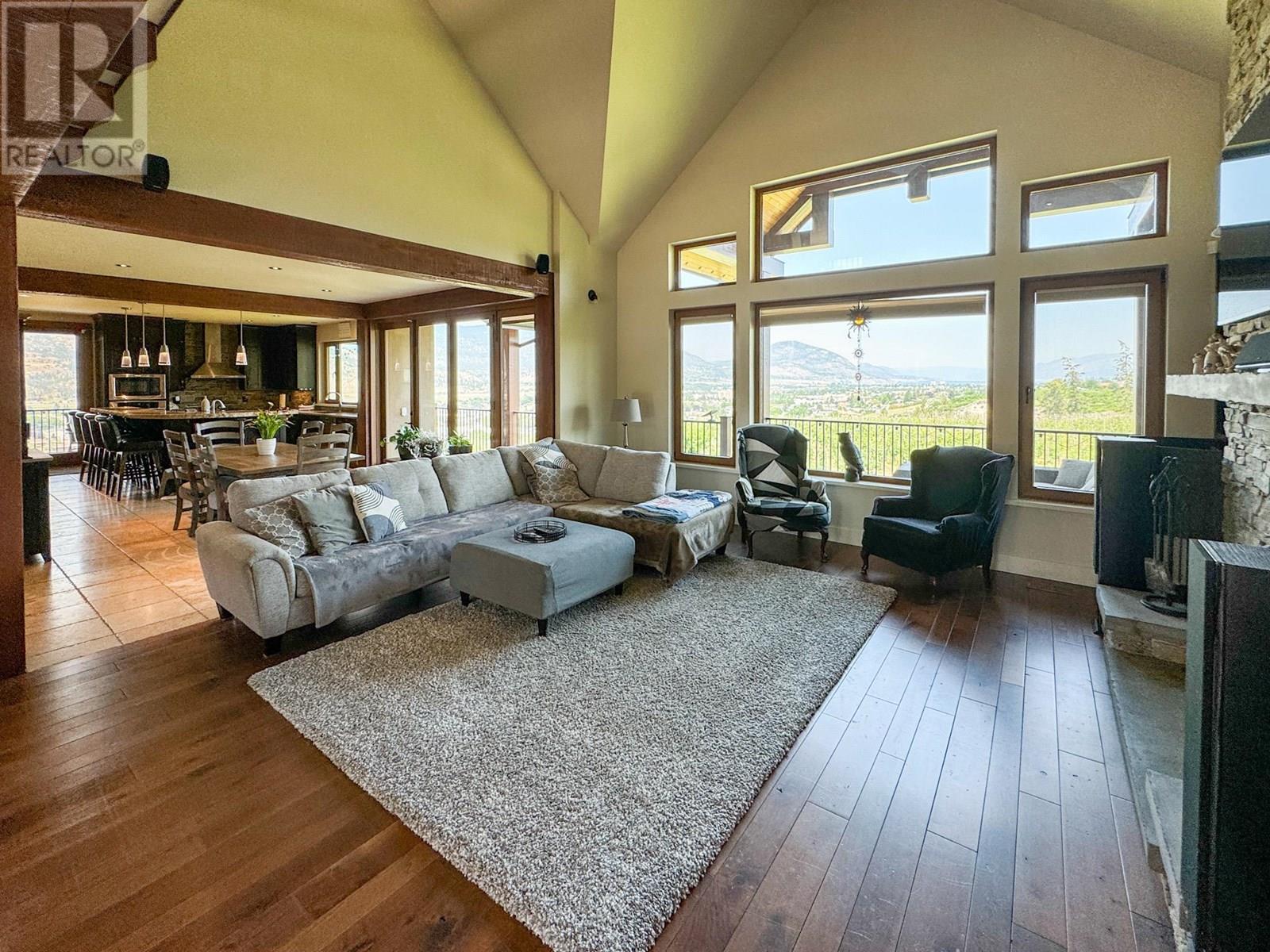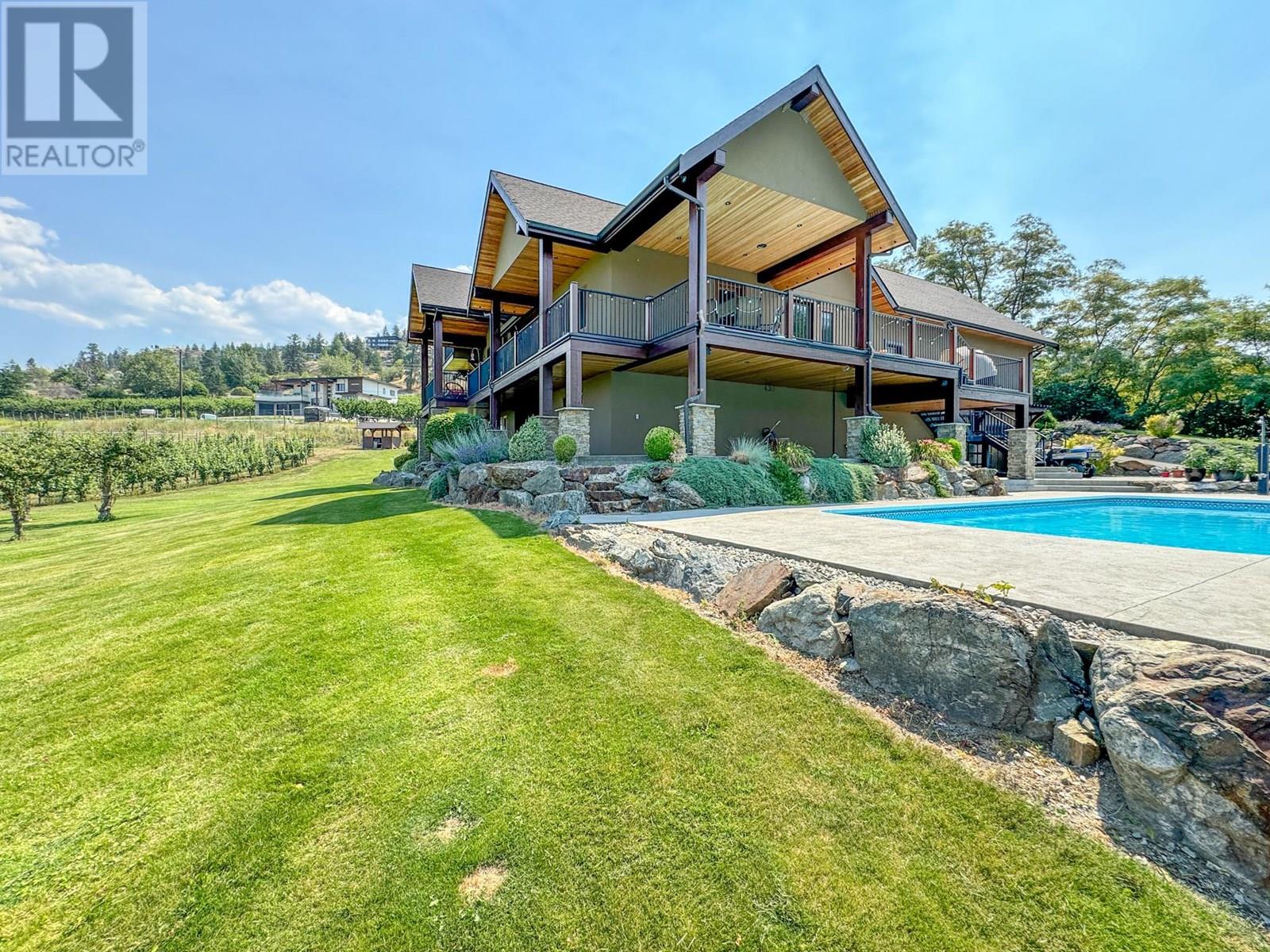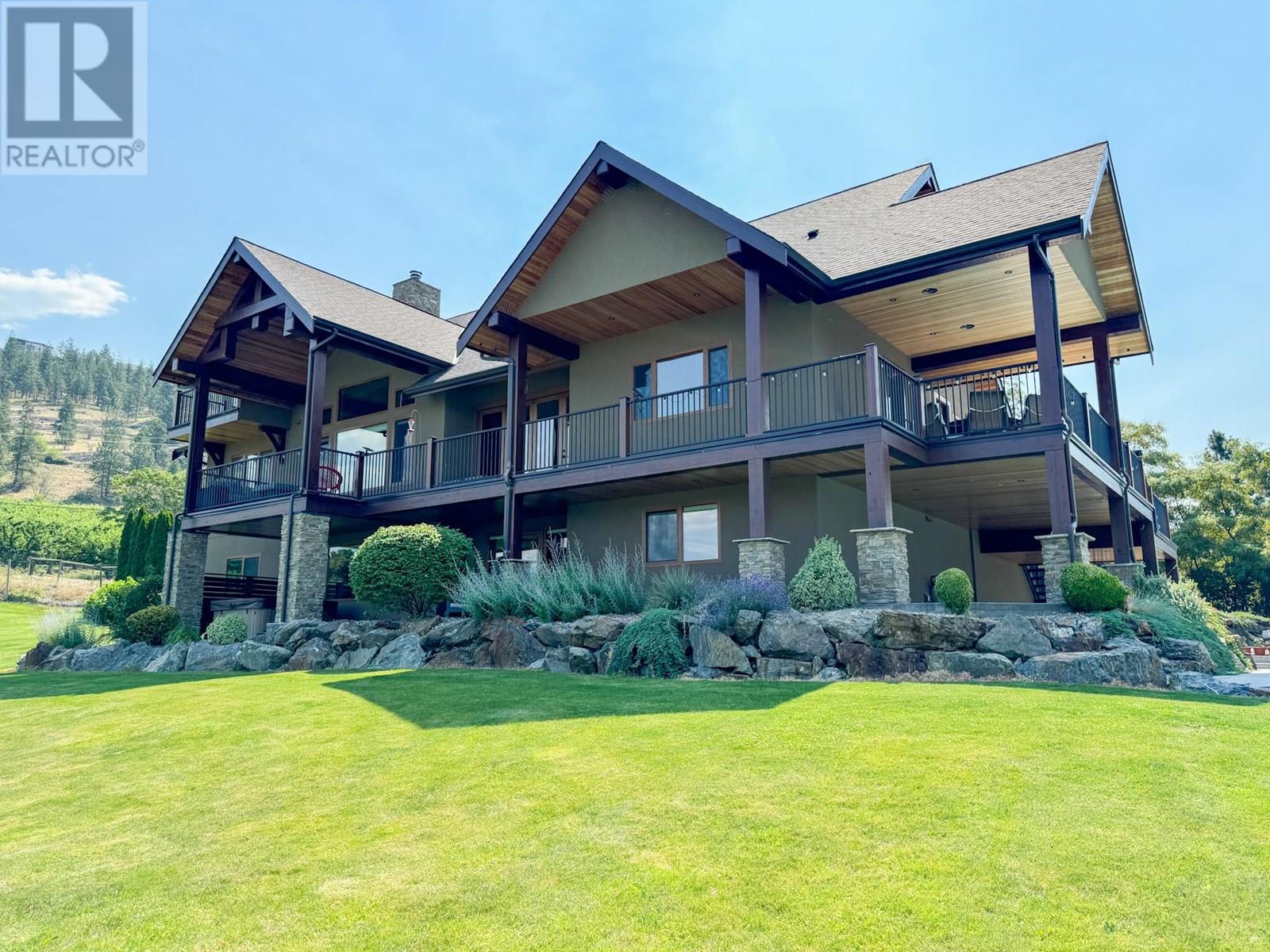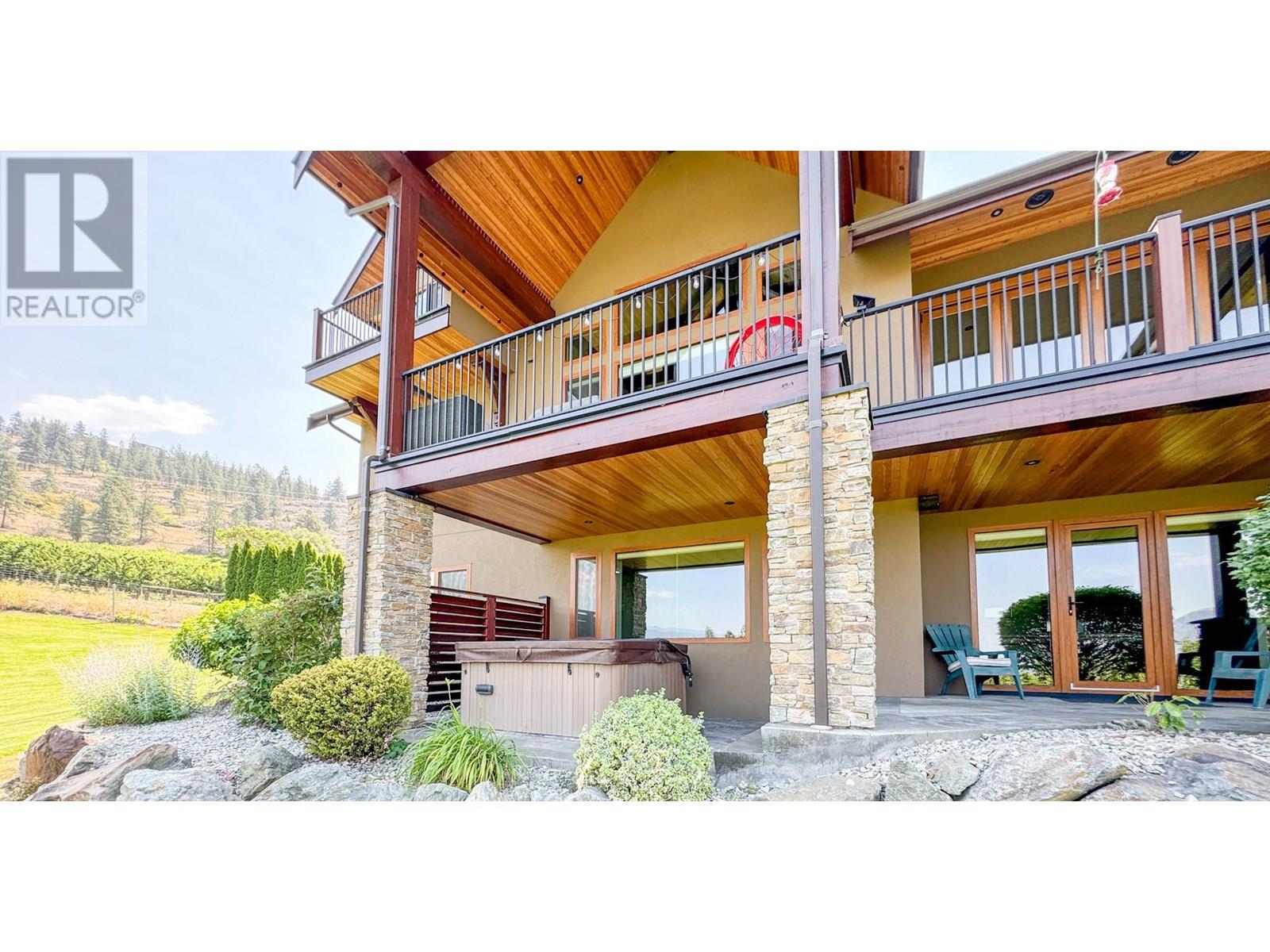 Stunning custom-built 5 bedroom, 5 bathroom executive home with Vineyard nestled on 17-acres located in the heart of South Okanagan’s Wine Country. Enjoy the panoramic views of lush vineyards and majestic mountains, blending natural beauty with sophisticated living. This Modern Rustic residence boasts nearly 10,000 square feet of meticulously designed living space, with stone and wood exteriors that integrate seamlessly with the landscape. An expansive driveway leads to a multi-car garage. Inside, the open-concept living area features high ceilings, large windows, and a stunning stone fireplace. The gourmet kitchen, equipped with custom cabinetry, live edge granite countertops, and state-of-the-art appliances, is ideal for hosting gatherings. The master suite, situated on its own floor, offers a private retreat with a luxurious en-suite bathroom and breathtaking views. Additional highlights include a home bar, a spacious laundry room with outdoor access, and a versatile garage space. The lower level features a large family/recreation room; ideal for a home theater or game room, an exercise area, a wine cellar, and a workshop with garage door access. The outdoor area is equally impressive, with landscaped gardens, salt water swimming pool, and a hot tub. Plantings consist of approx 1.4 acres each of Gamay Noir & Pinot Gris and 5 acres Gewurztraminer which is a perfect blend for those seeking a Vineyard lifestyle in one of the South Okanagan's most desirable locations. (id:47466)