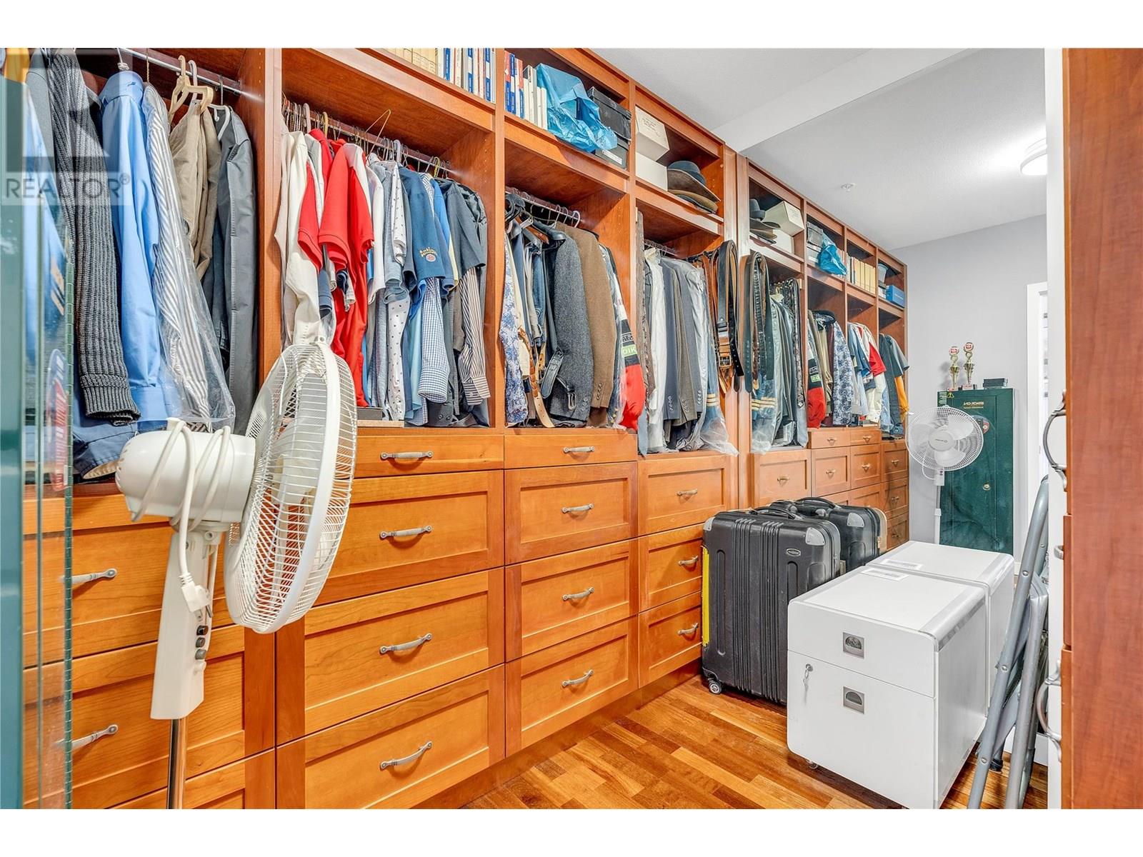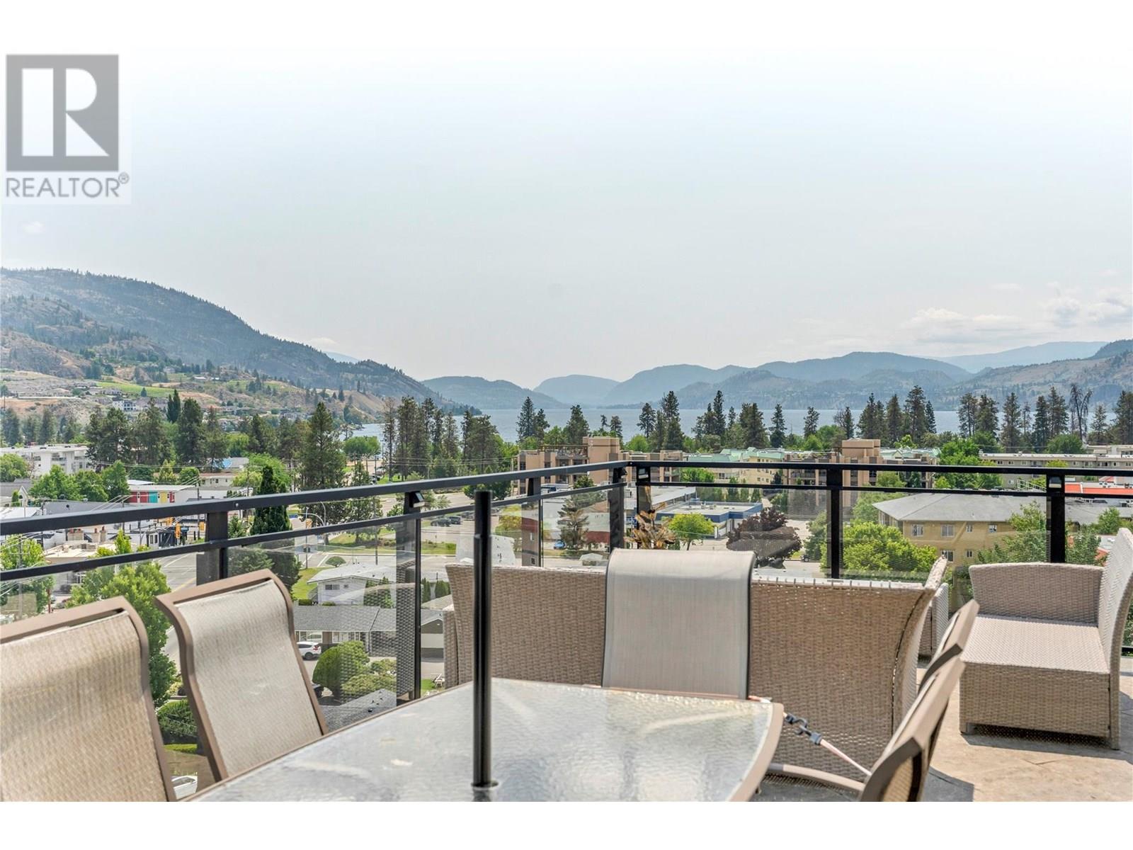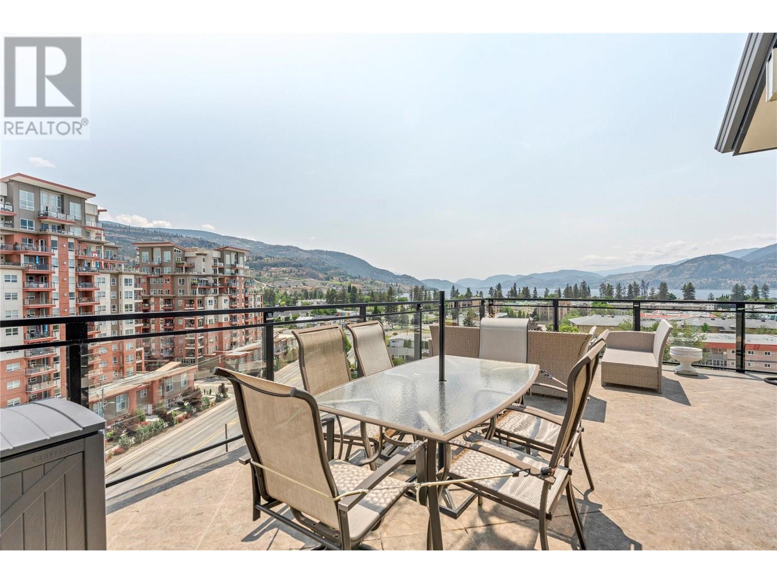 Experience luxury living in this stunning southeast corner penthouse suite at Alysen Place. Designed to impress, this beautifully customized home features floor-to-ceiling windows that capture breathtaking panoramic views of the lake and surrounding mountains. The spacious kitchen is a chef’s dream, equipped with high-end upgrades including a built-in Miele coffee maker, trash compactor, beverage fridge, vacuum kick, and a large island—perfect for entertaining. The living room boasts a soaring 14' vaulted ceiling with hidden in-wall speakers for a sleek, modern finish. Step outside to an expansive 800 sq ft covered wrap around deck, complete with tile flooring, built-in speakers, and a gas BBQ hookup—ideal for enjoying warm Okanagan evenings. Additional highlights include two premium side-by-side parking spots conveniently located near the elevator, and secured storage. The monthly strata fee of $865.64 covers heat, hot water, gas for the BBQ, and building insurance, providing comfort and peace of mind in this exceptional property. (id:47466)