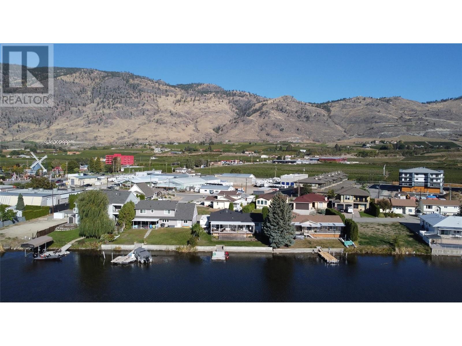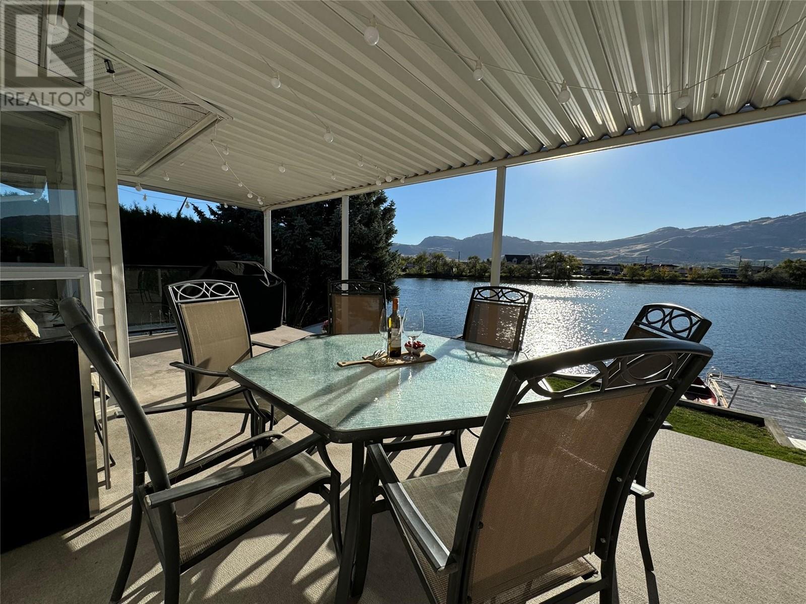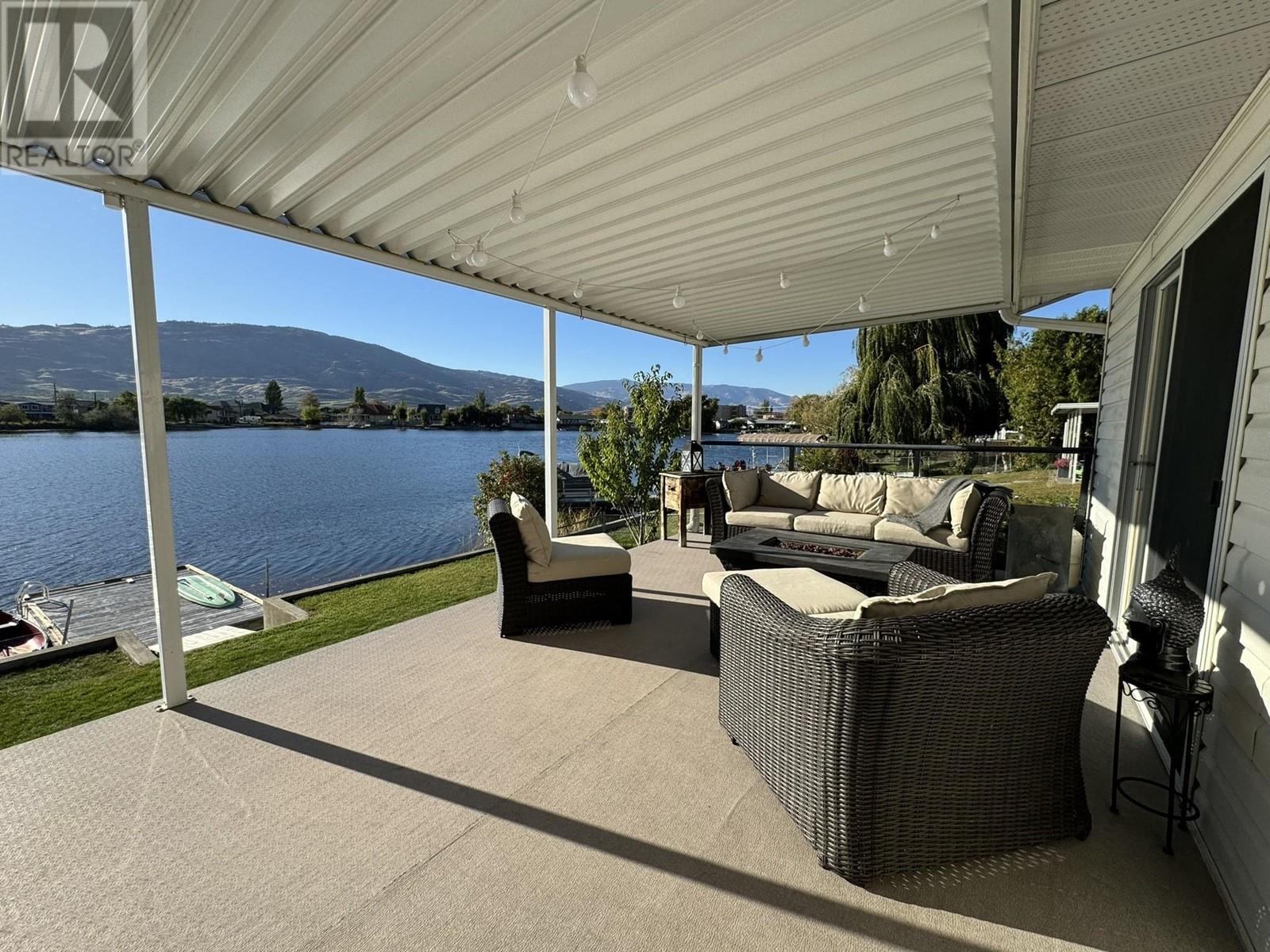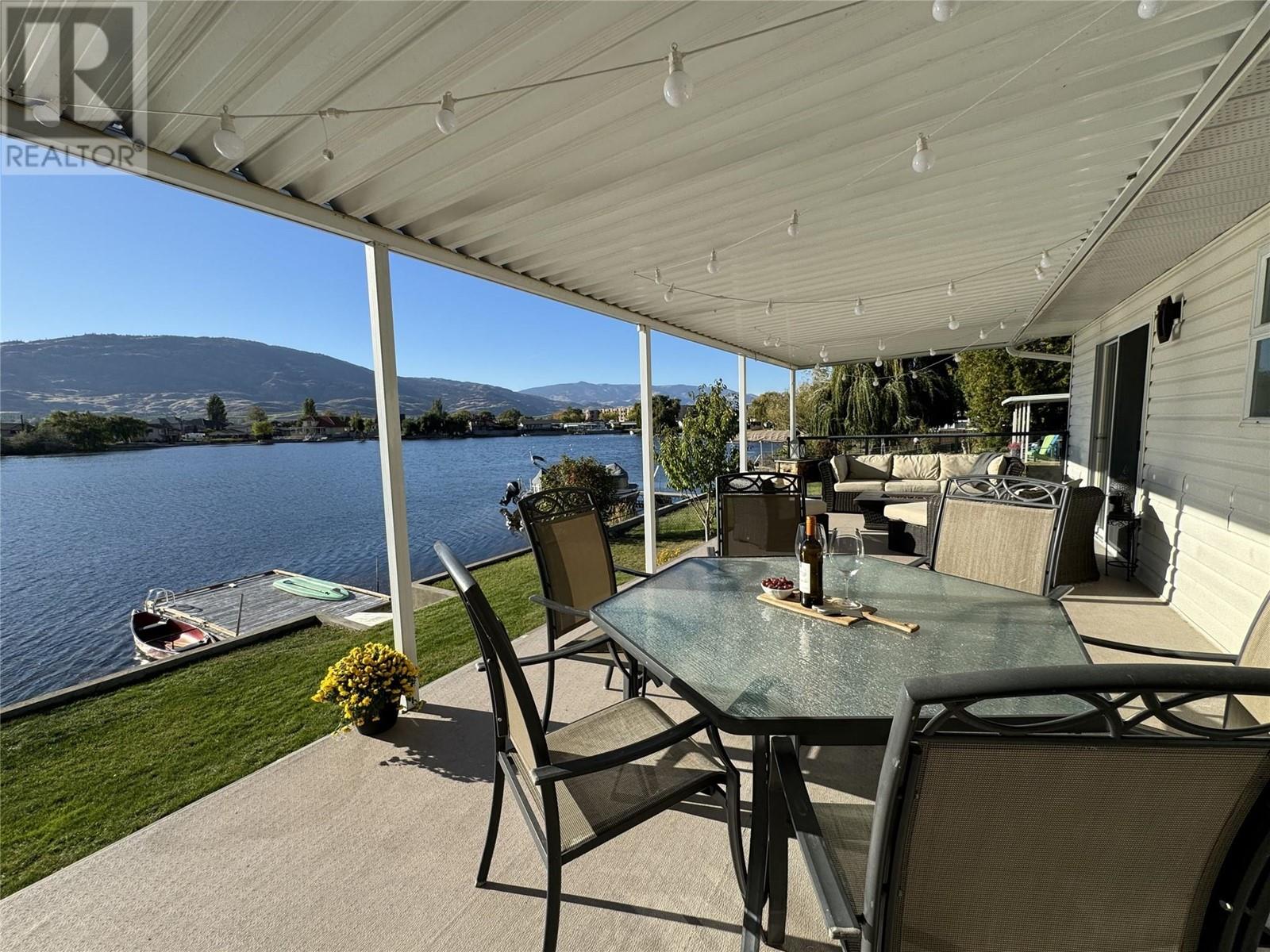 WATERFRONT HOME ON PEACEFUL SOLANA BAY Savor your morning coffee or a glass of one of the region’s exquisite local wines while watching the sunset from your expansive covered porch. Just steps away, your private dock awaits, offering easy access to the main lake for boating adventures. This prime location provides shelter from the wind, even during the occasional Osoyoos storm. Designed for effortless entertaining, this single-level rancher is perfect for hosting close family and friends all summer long. As fall arrives and the weather cools, gather around the outdoor fire pit, basking in the warmth while listening to the soft chorus of crickets. This comfortable 3-bedroom, 2-bathroom home boasts a spacious, open-concept layout, offering breathtaking views of the surrounding mountains and serene bay. The ideal location also places you just a short walk from popular local restaurants, amusement parks, coffee shops, and renowned wineries. Many extra features include: pure fibre internet (Telus), Full Hookups for RV, New Energy efficient appliances (LG). new roof (1017), Underground water sprinklers, New tankless hot water on demand heater, New custom blinds, New flooring, Bluetooth bathroom fans, Ceiling fans in each bedroom, Smart Home light switches, LED energy efficient lights, Central Vacuum with kick plate in kitchen. Make this peaceful retreat your year-round sanctuary, where every season brings its own charm and adventure. (id:47466)