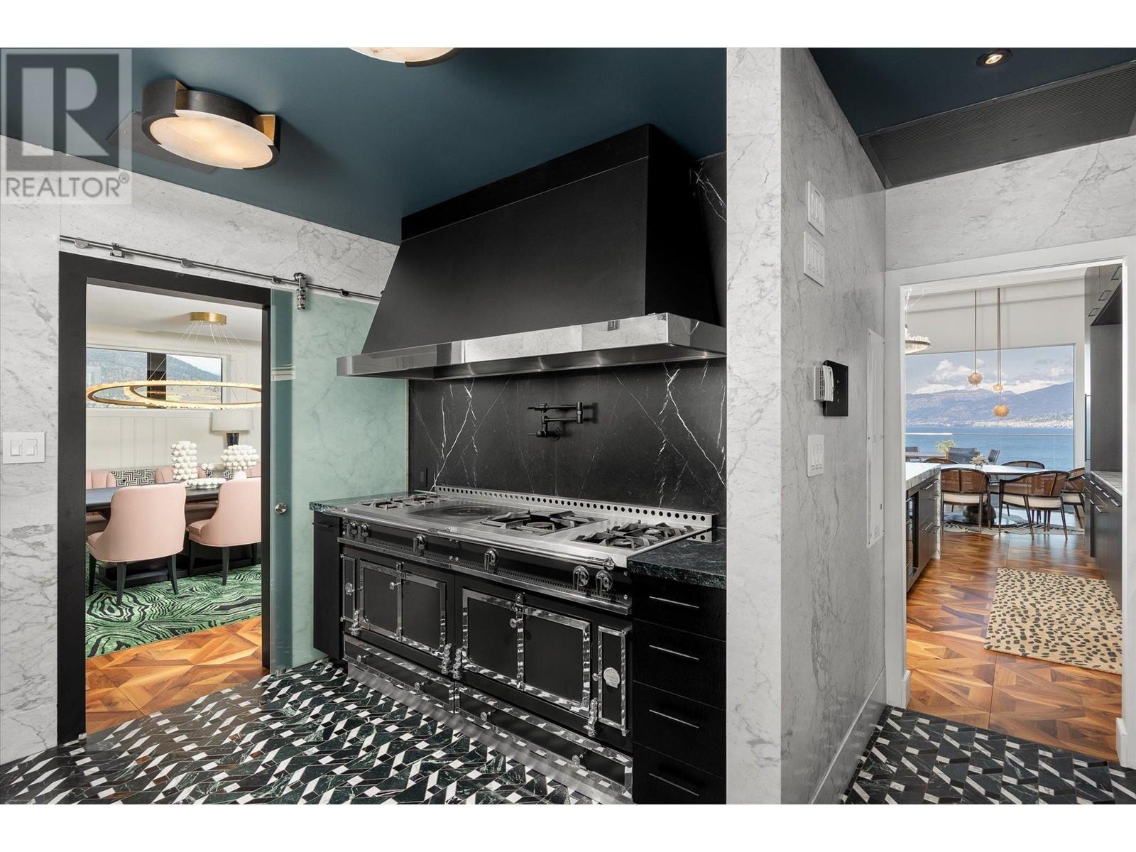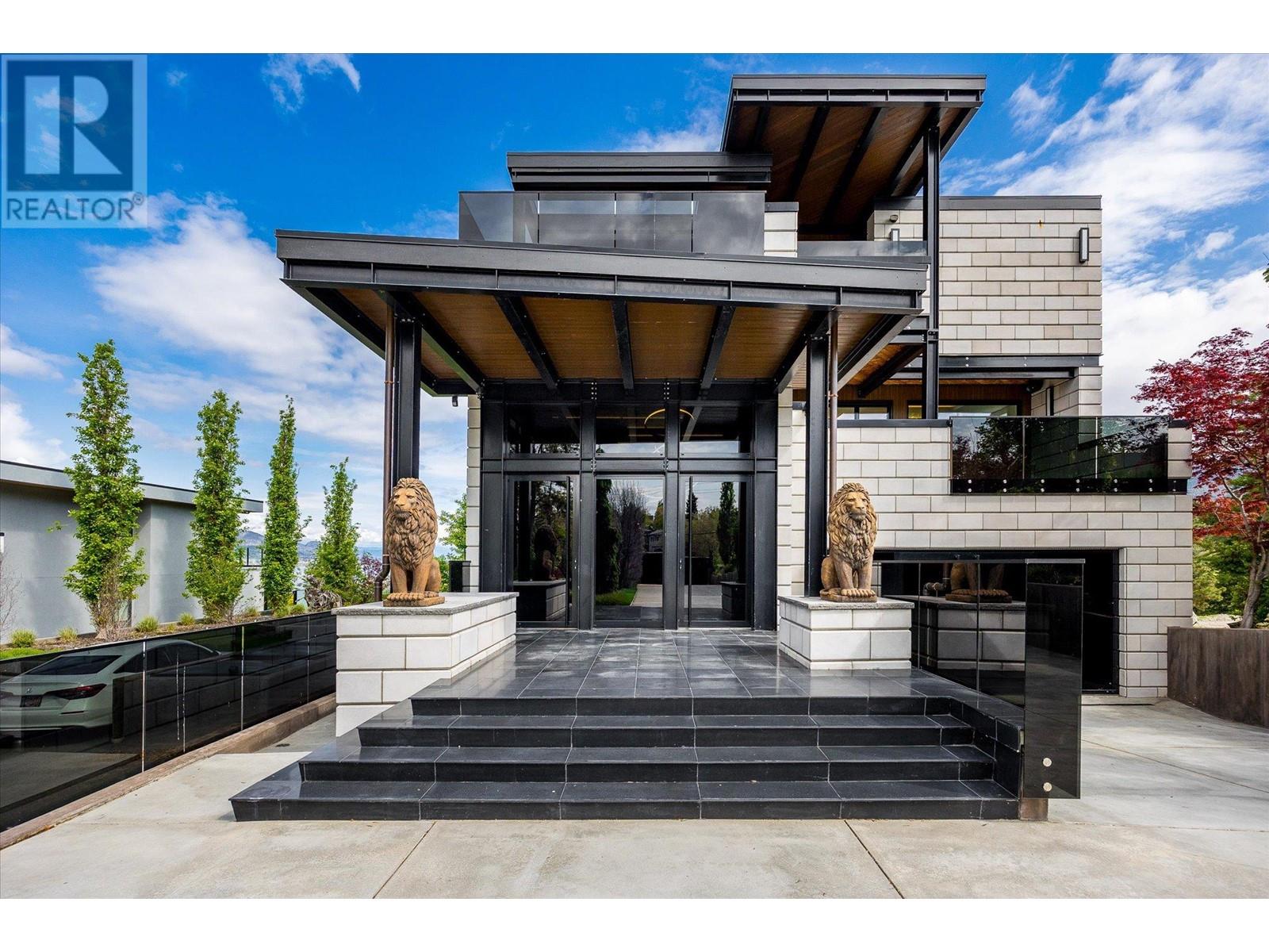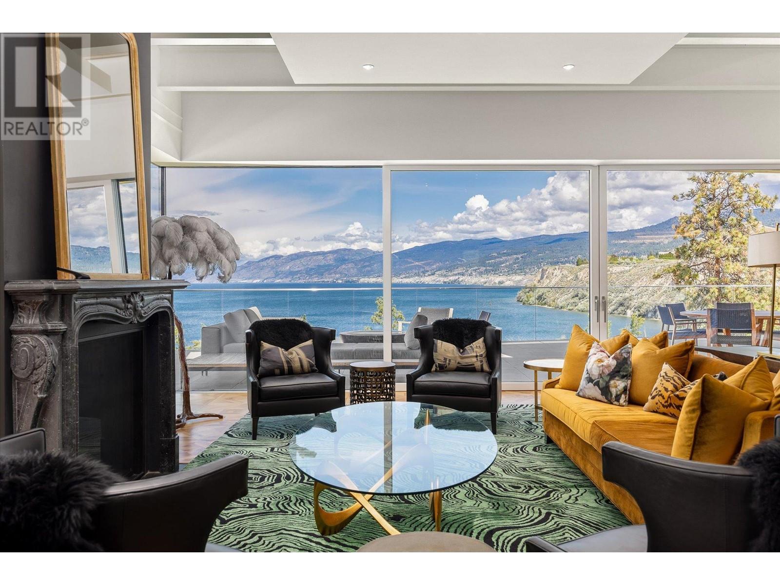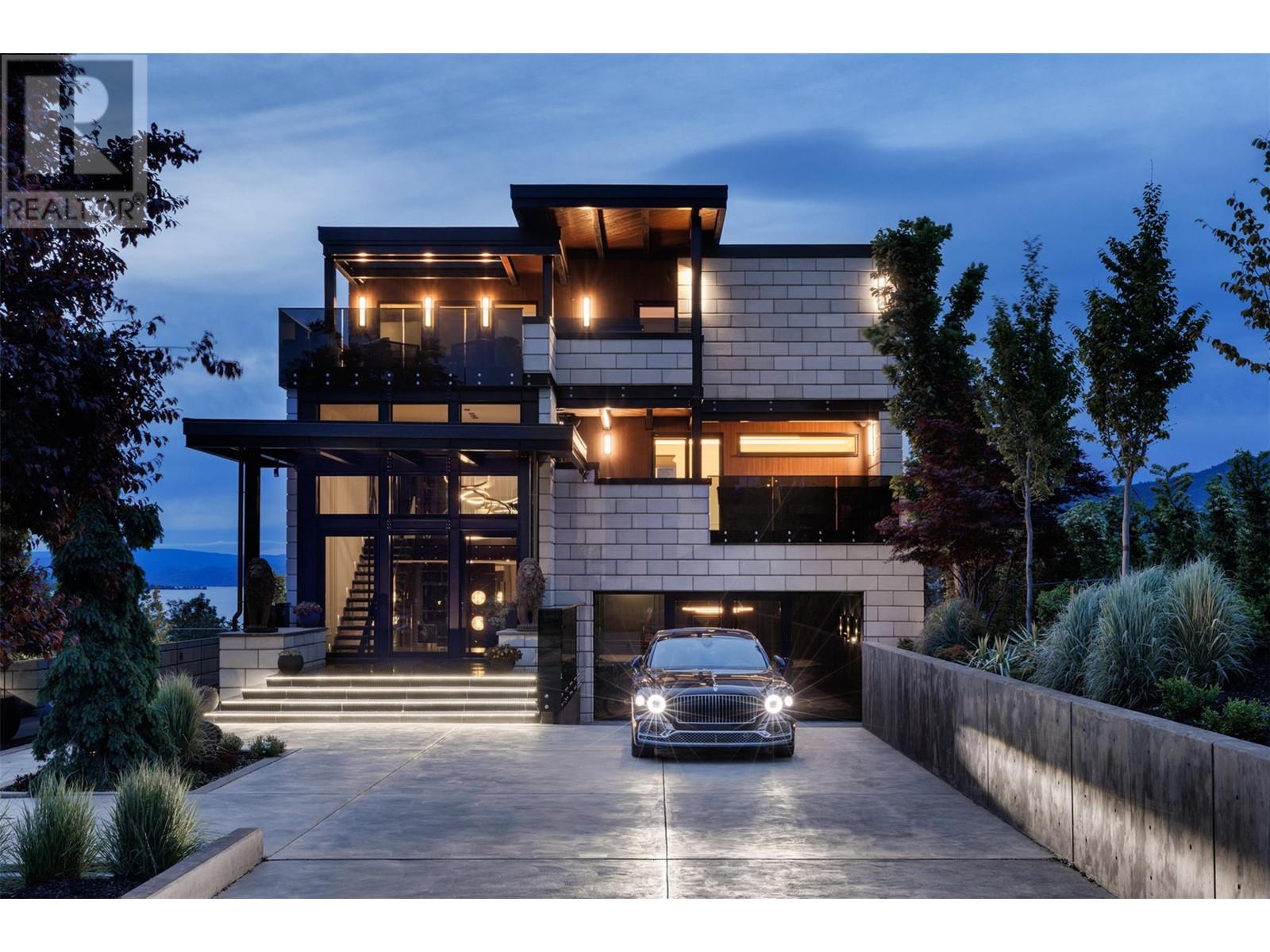 Discover a masterpiece at the southern tip of Okanagan Lake. A property that defines bespoke in one of the world’s most breathtaking settings. This estate seamlessly blends modern amenities with timeless European-inspired craftsmanship. From the custom vertical gate, you approach the home featuring open steel beams, intricate marble mosaic and hand crafted walnut floors. Seven expansive patios surround its exterior, offering sun, shade and unmatched lake views. The interior combines industrial strength with refined luxury. Every detail speaks of curated elegance - gold leaf mirrors from Paris, Christopher Boots lighting, and floating Verde marble staircases. The third floor great room features a wall of sliding glass doors and with its height, the feeling of sailing northward up the lake. A sophisticated working kitchen with commercial-grade La Cornue appliances is adjacent to your gathering space for family and friends. The primary suite offers panoramic lake vistas, a large balcony, and luxurious Nero Marquina marble in the ensuite, complete with twin soaking tubs facing dramatic sunsets. The home flows with natural light, accentuating its harmony of old-world charm and modern sophistication. Surrounded by seasonal beauty, from vibrant summers to rich autumn hues, this residence is more than just a home; it is a statement, a true sanctuary in one of Canada’s most stunning locations. Truly, this residence is best experienced in person to be fully appreciated. (id:47466)