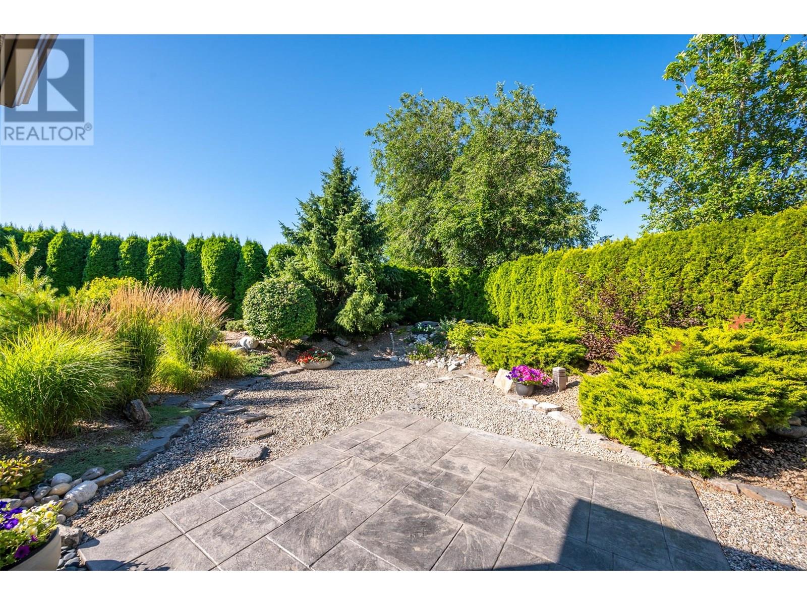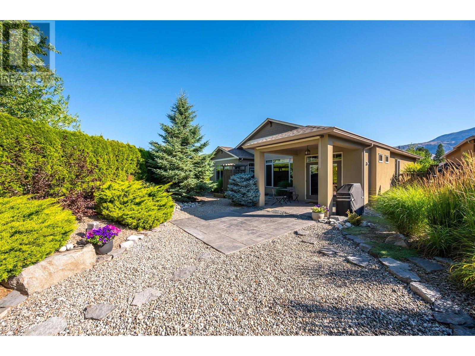 Welcome to Arbour Crest, a sought-after 55+ gated community known for its exceptional quality and beautifully maintained grounds. This stunning 2-bedroom plus den rancher offers easy one-level living with vaulted ceilings and an open-concept layout. The spacious kitchen features quartz countertops, a large island, and flows effortlessly into the dining and living areas, complete with a cozy gas fireplace. The primary suite is a true retreat with double French doors to your private backyard, a large walk-in closet, double vanities, and a walk-in shower. The versatile den makes a perfect office, TV room, or could easily be converted into a third bedroom. The guest bedroom enjoys its own private “wing” with full bath—ideal for visitors or extended stays. Outside, enjoy low-maintenance xeriscape landscaping, a large stamped concrete patio—perfect for entertaining or adding a hot tub—and an oversized driveway on a pie-shaped lot that offers added space and privacy. This home combines comfort, style, and smart design in a quiet, secure community just minutes from golf, shopping, lake access, and downtown Oliver. Low strata fees and well maintained grounds and home make this the perfect move in ready retirement ""dream home"". (id:47466)